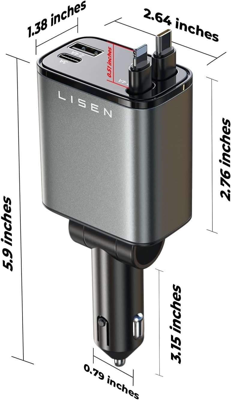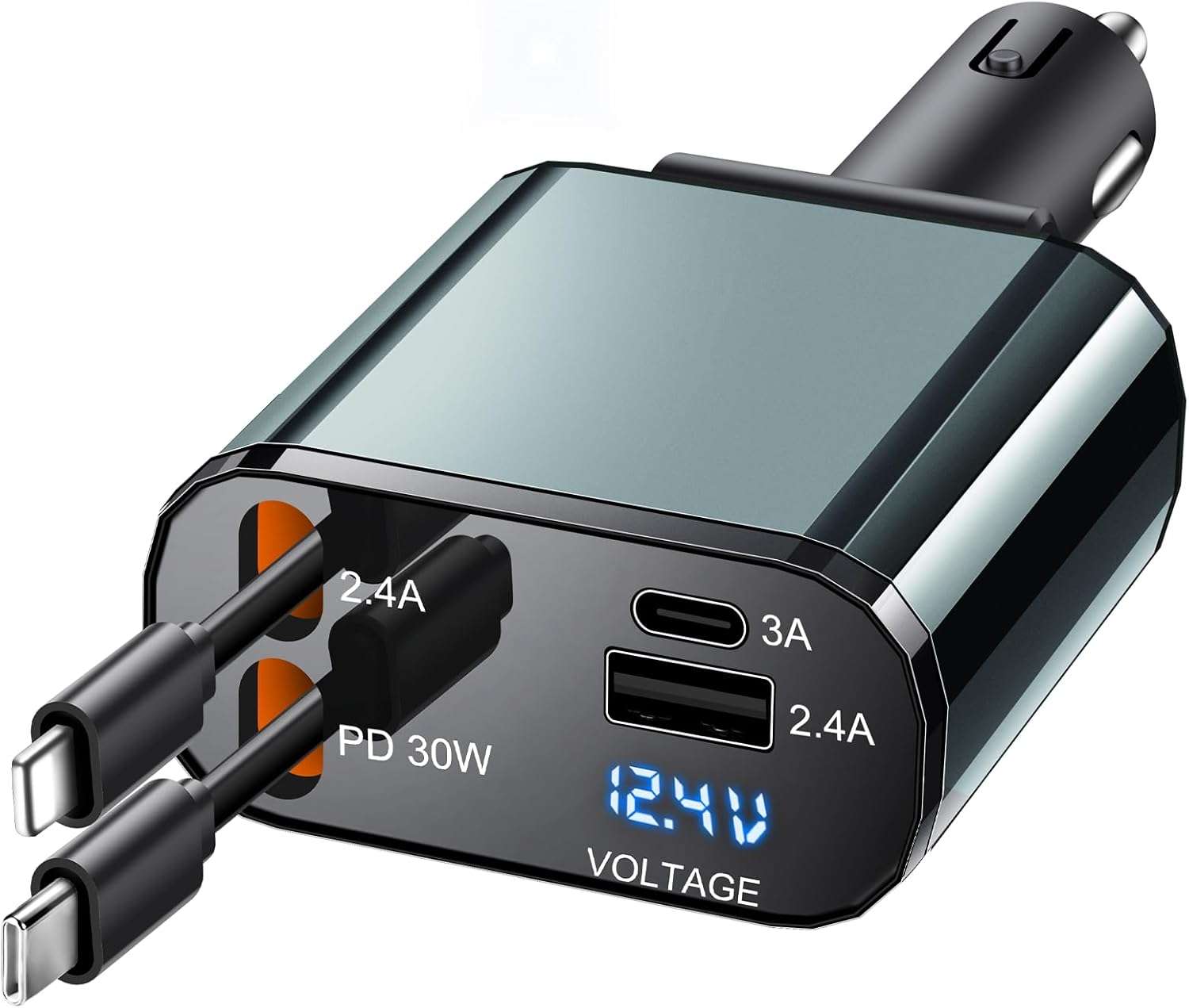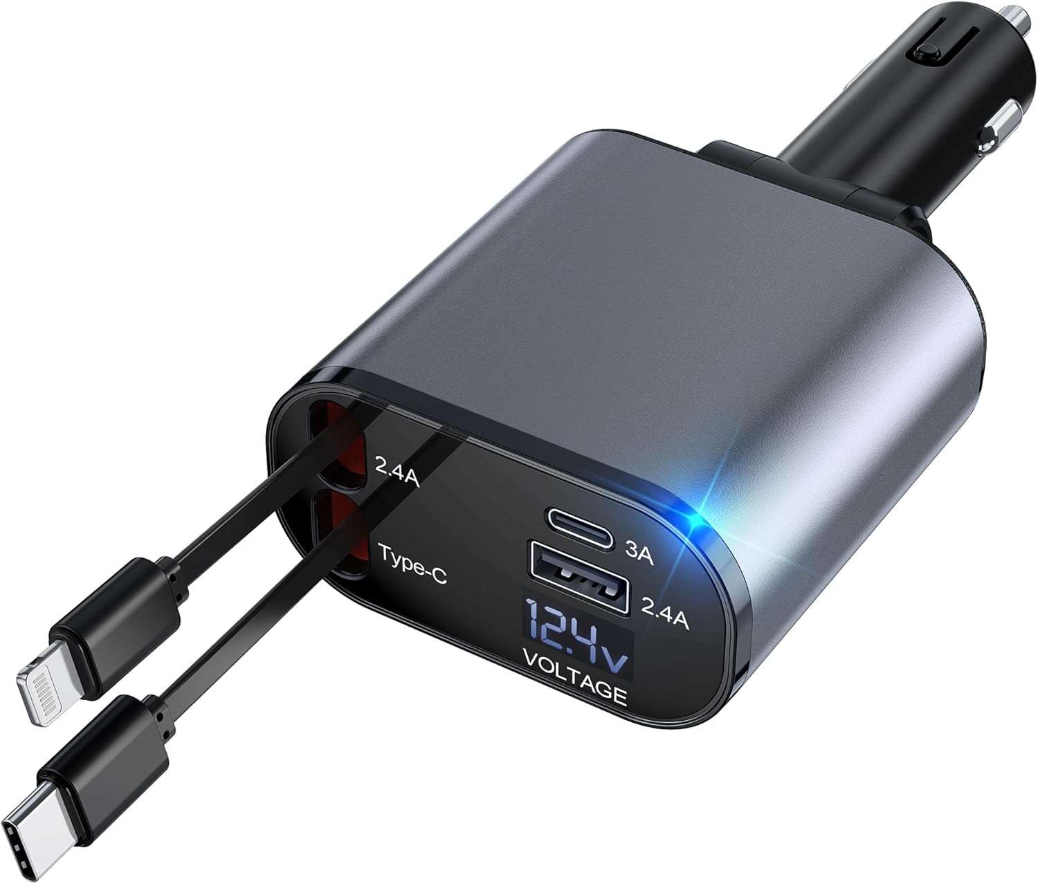 الوصف: شاحن العربية الرباعي القابل للسحب هو الحل الأمثل لشحن أجهزتك بسهولة وأنت في الطريق. تصميمه أنيق ومتين، وبييجي بكابلين مدمجين يدعموا الآيفون والأندرويد، بالإضافة لمنفذين تقدر توصل فيهم كابلات تا