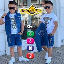 طقم اولادى 3 قطع ، بدلة جينز رباعية وتيشرت سنجل ليكرا قطن٥٦٠ج.م