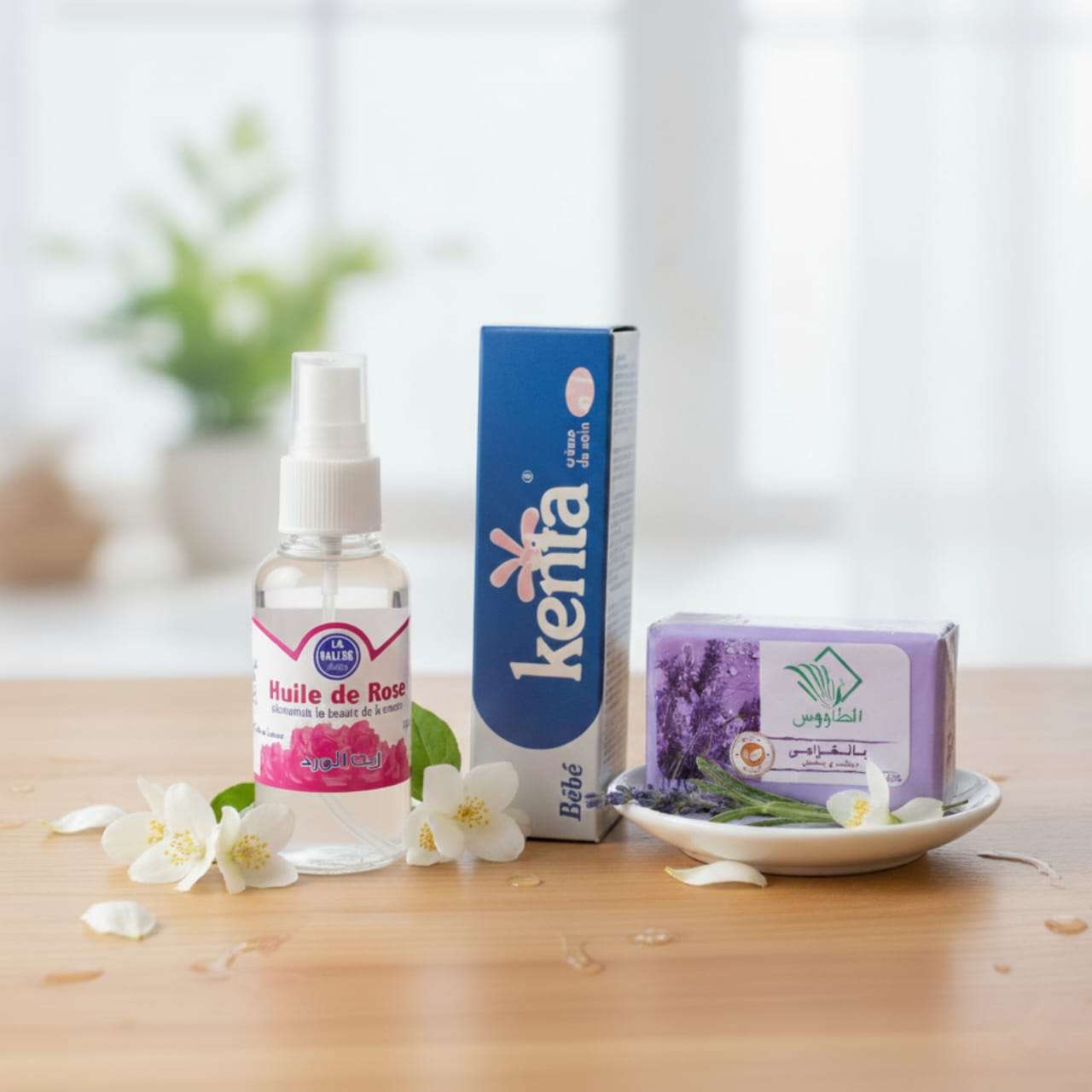 باكدج تفتيح البيكيني عباره عن زيت ورد ابيض كريم كينتا صابونه الطاووس بالخزامي