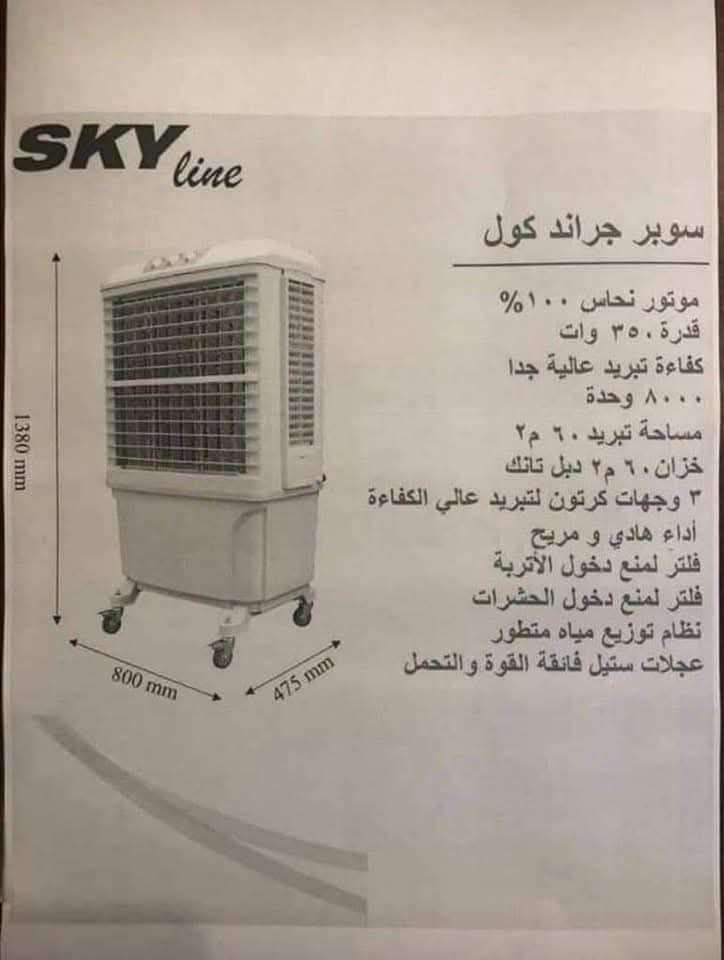 *مكيف سكاي لاين صحراوي* ضمان 5 سنوات -المميزات: - كفاءة تبريد عالية ٦ الف وحدة. - موتور نحاس ١٠٠ %. - مساحة تبريد ٥٠ م. - خزان دبل تانك ٥٠ لتر. - ٣ واجهات كرتون لتبريد عالي الكفاءة. - أ