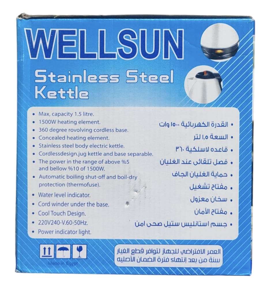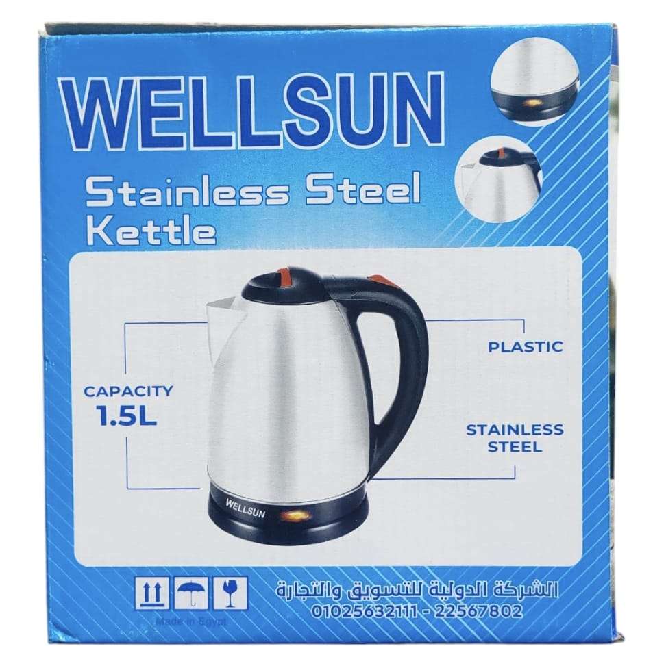 كاتيل ويلسون، 1.5 لتر، 1500وات - ستانلس ستيل القدرة الكهربائية: 1500 وات السعة: 1.5 لتر قاعدة لاسلكية بزاوية دوران 360 درجة عنصر تسخين مخفي جسم الغلاية مصنوع من الستانلس ستيل تصميم لاس