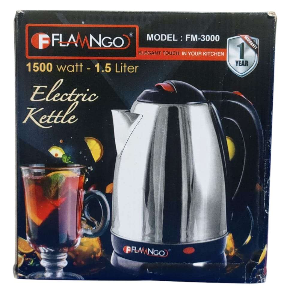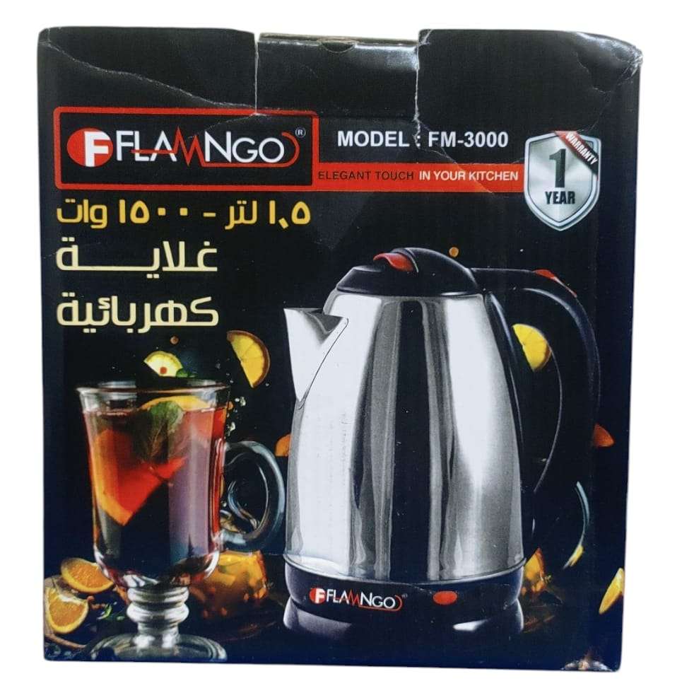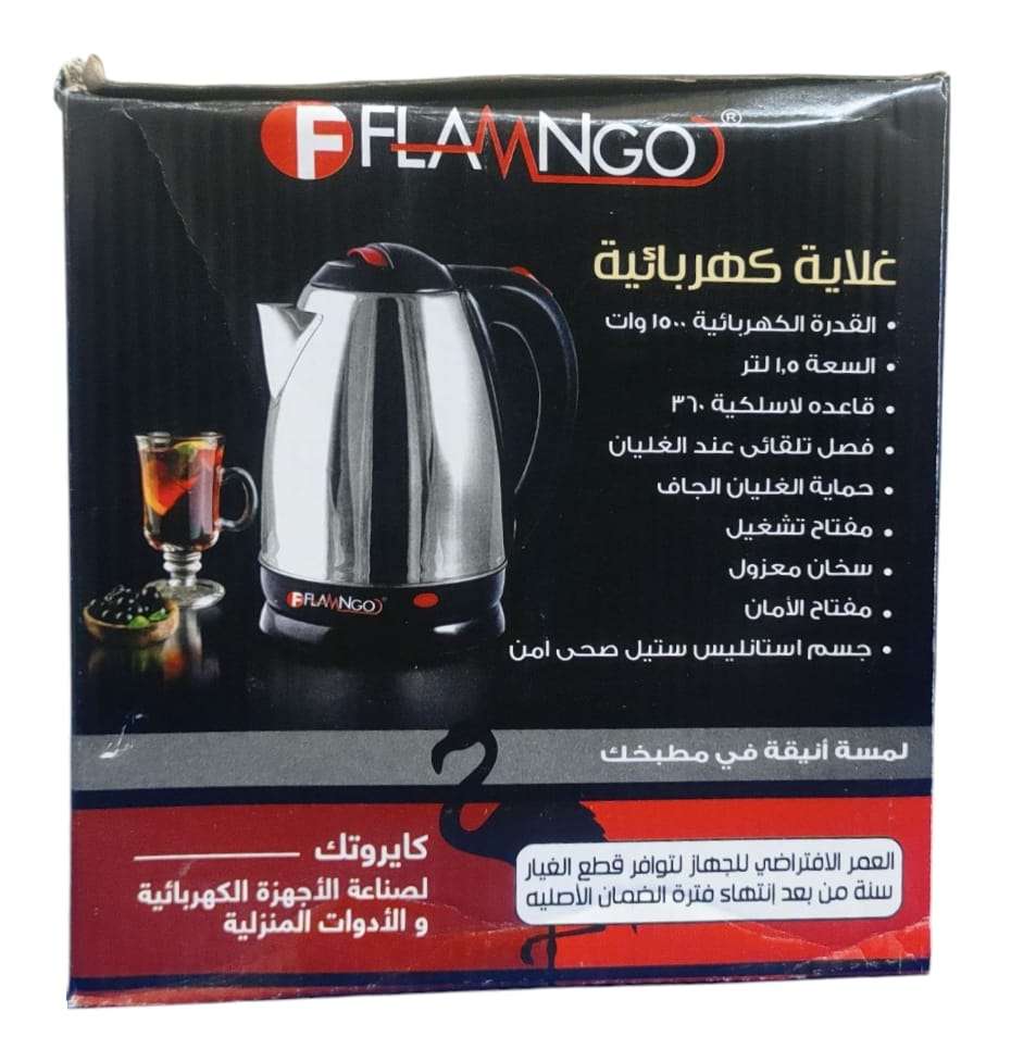 فلامنجو غلاية كهربائية ، 1.5 لتر ، 1500وات القدرة 1500 وات السعة 1.5 لتر هيكل ستانلس ستيل إيقاف تشغيل يدوي واوتوماتيكي مؤشر ضوئي