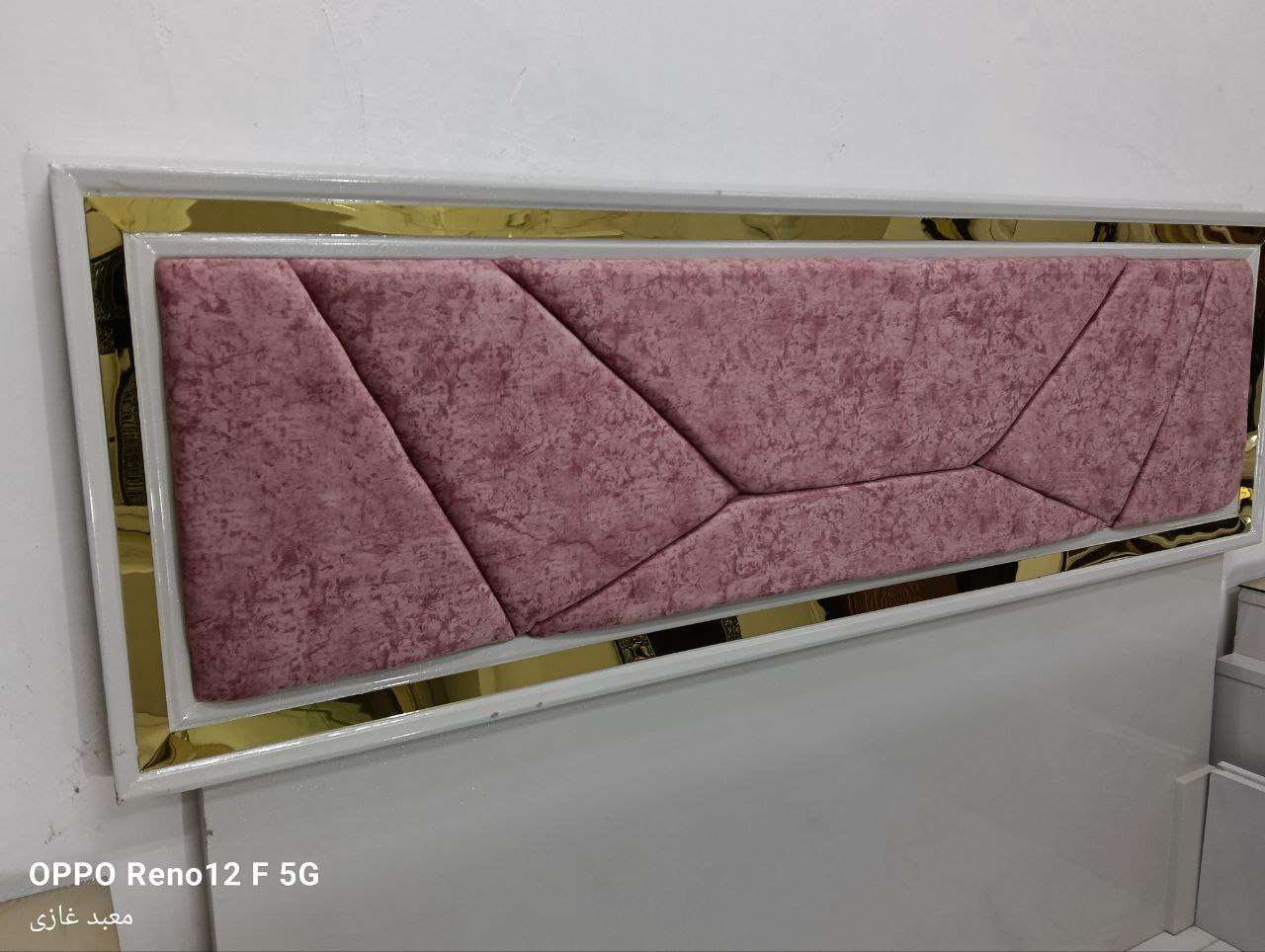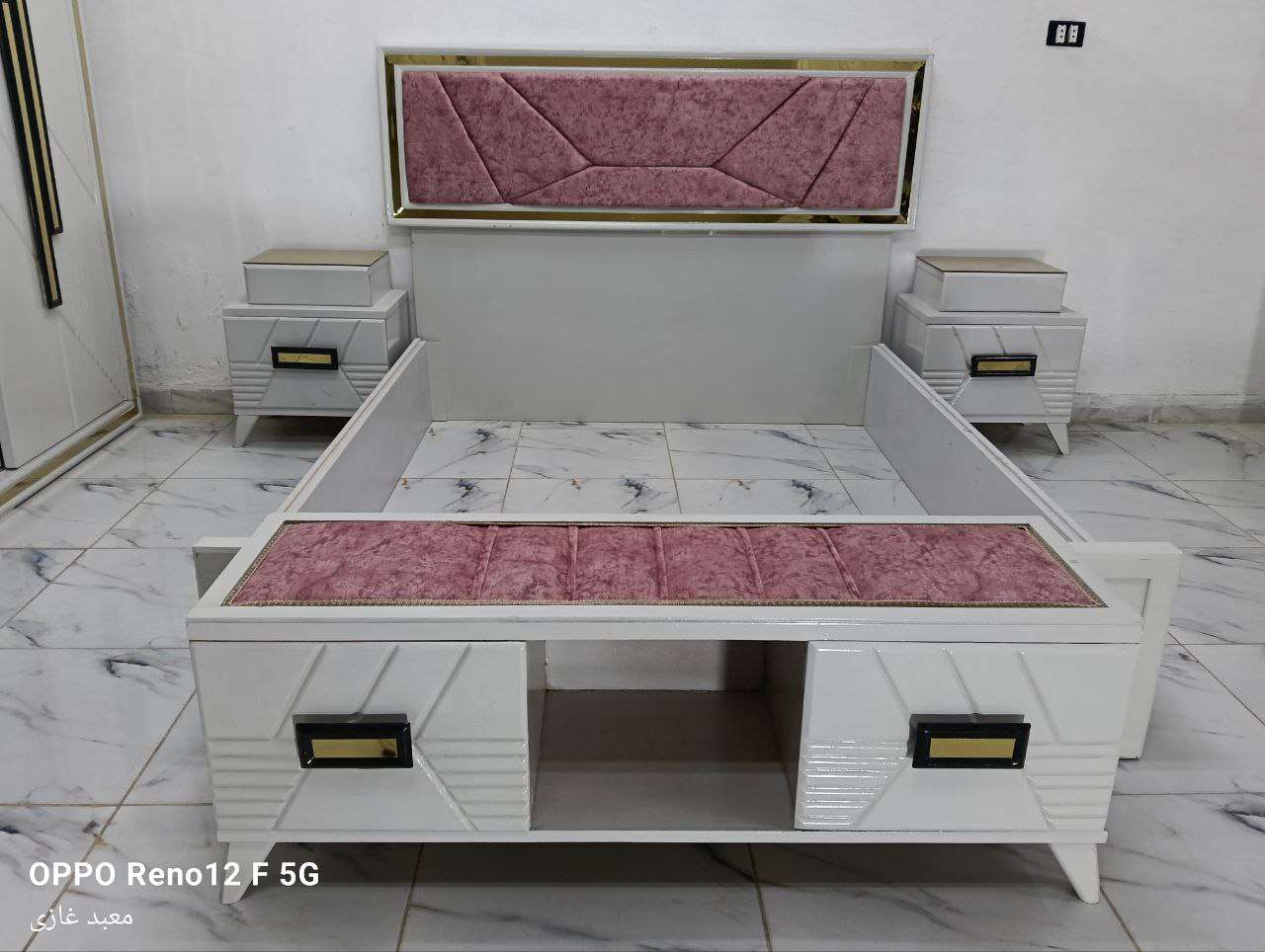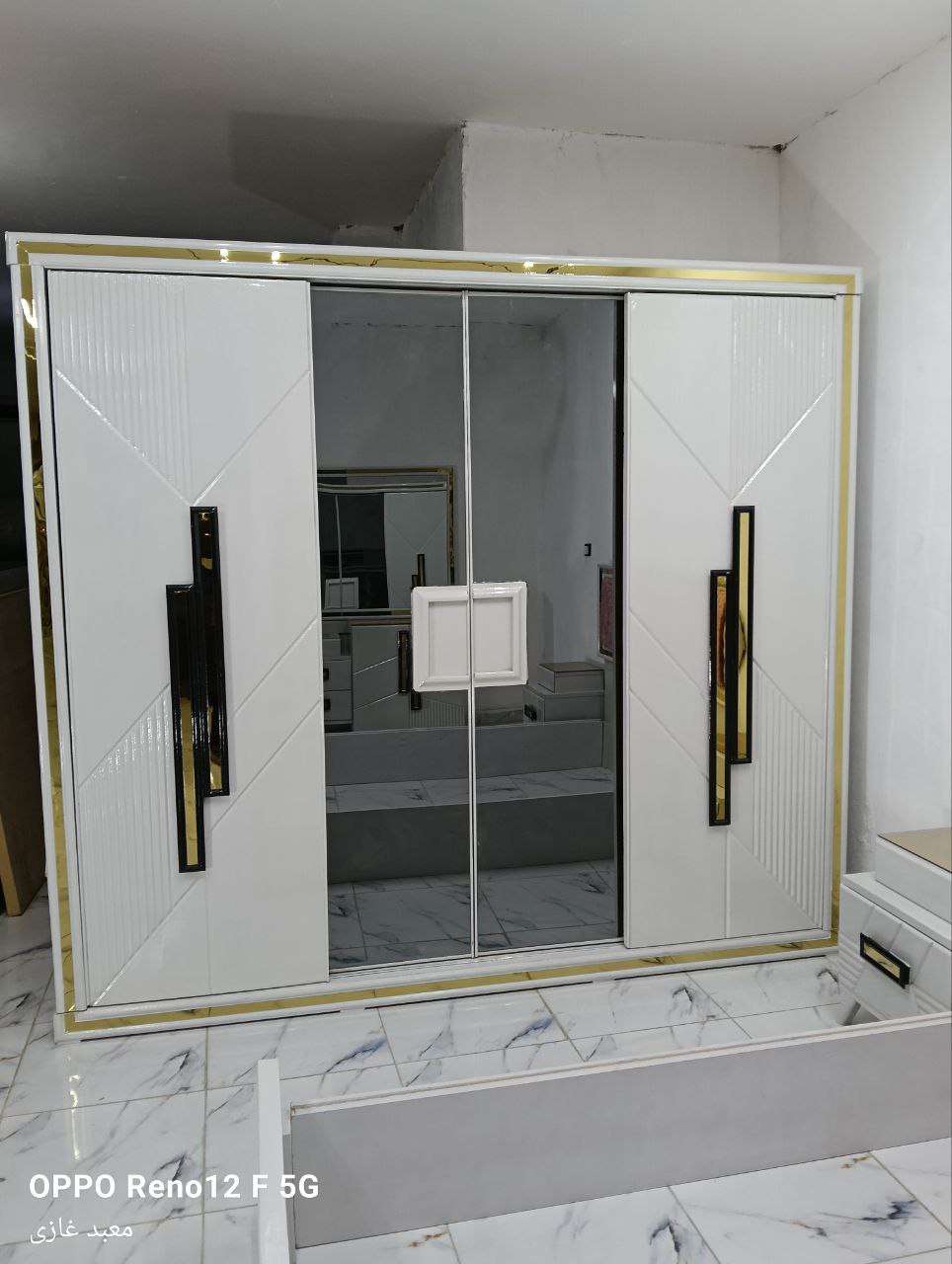 فوري على التحميل غرفه نوم المقبض بشكلها الجديد دولاب ٢٦٠ ارتفاع ٢٤٠ عمق ٦٠ خشب كبس محمل ضلفتين ازاز وشرايط استانلس ذهبي سرير 160×195 بتنجيد فنش عالي بشرايط استانلس ٢ كيمود بادراج زان بازاز فام