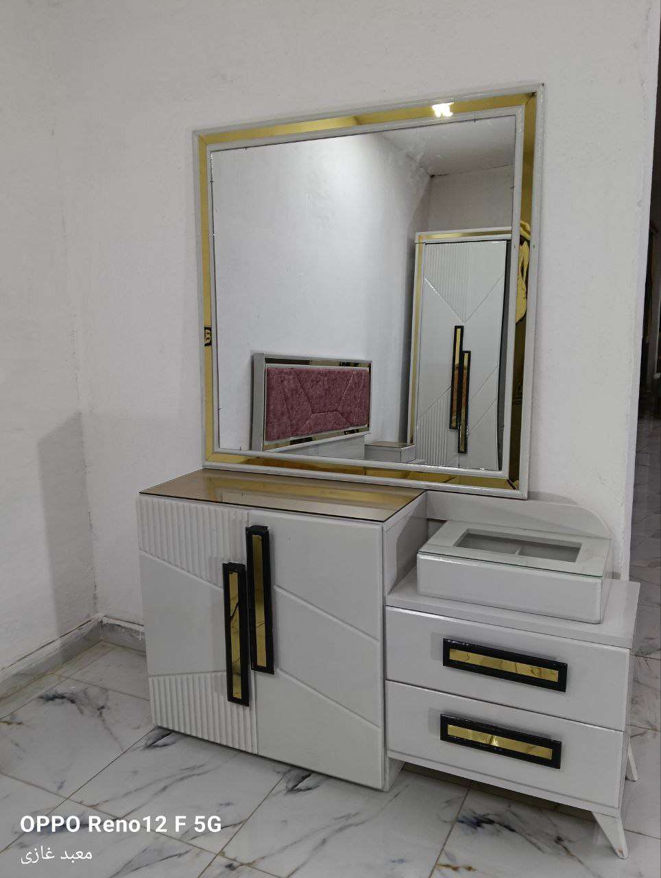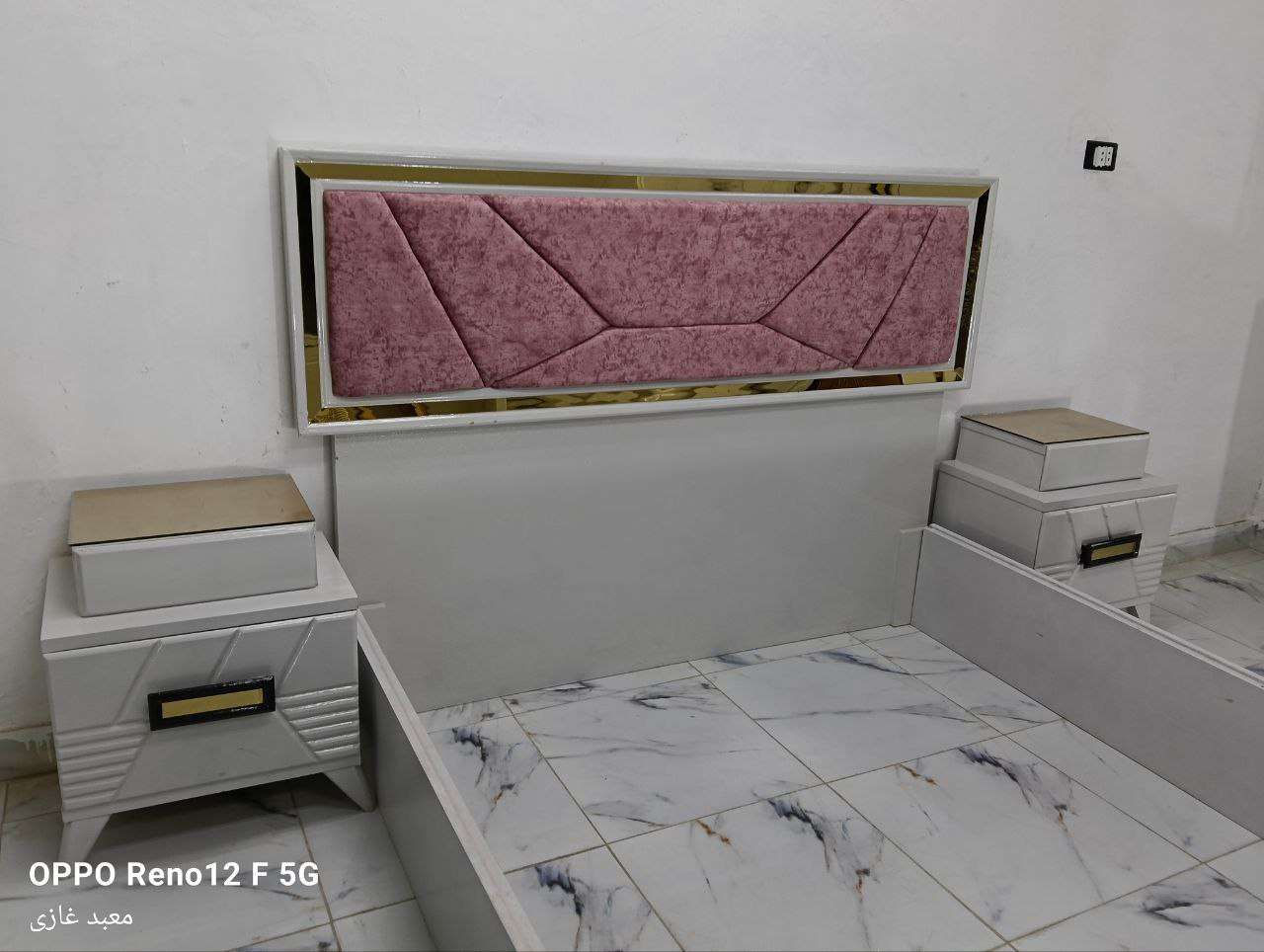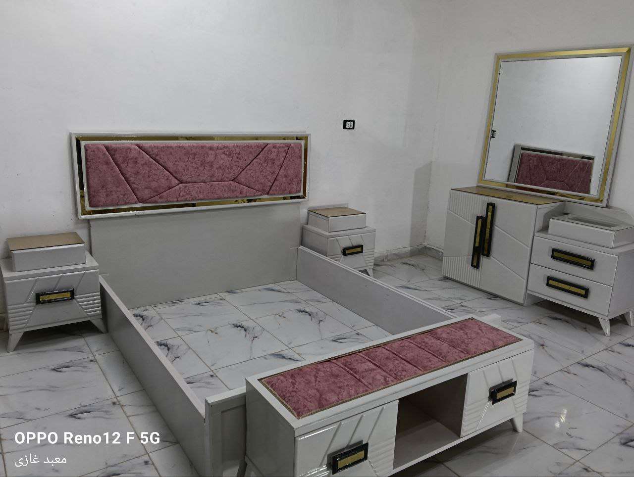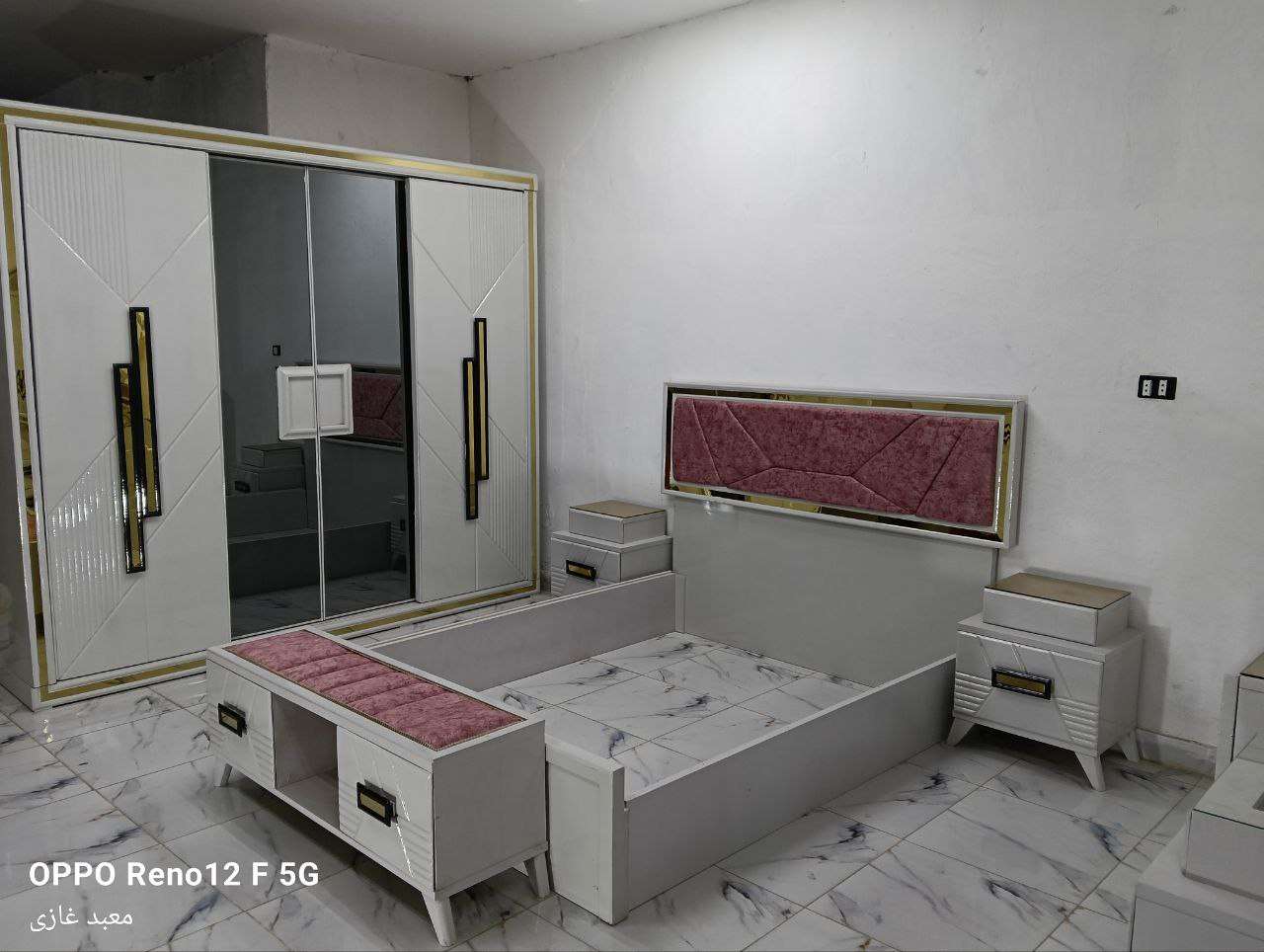 فوري على التحميل غرفه نوم المقبض بشكلها الجديد دولاب ٢٦٠ ارتفاع ٢٤٠ عمق ٦٠ خشب كبس محمل ضلفتين ازاز وشرايط استانلس ذهبي سرير 160×195 بتنجيد فنش عالي بشرايط استانلس ٢ كيمود بادراج زان بازاز فام