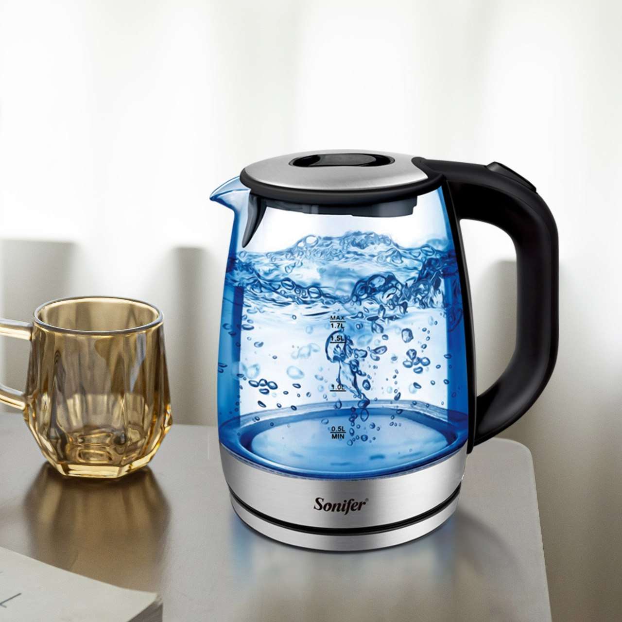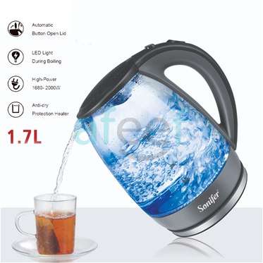 🛍️ غلاية كهربائية من سونيفر SF-2064 ✔️ غلاية كهربائية كاتيل 2200 وات - زجاج سعة 1.7 لتر مزود بإضاءه داخليه زرقاء ✔️ مؤشر مستوى المياه سهل القراءة، وقاعدة دوارة 360 درجة للاستخدام دون عناء. مع إغل