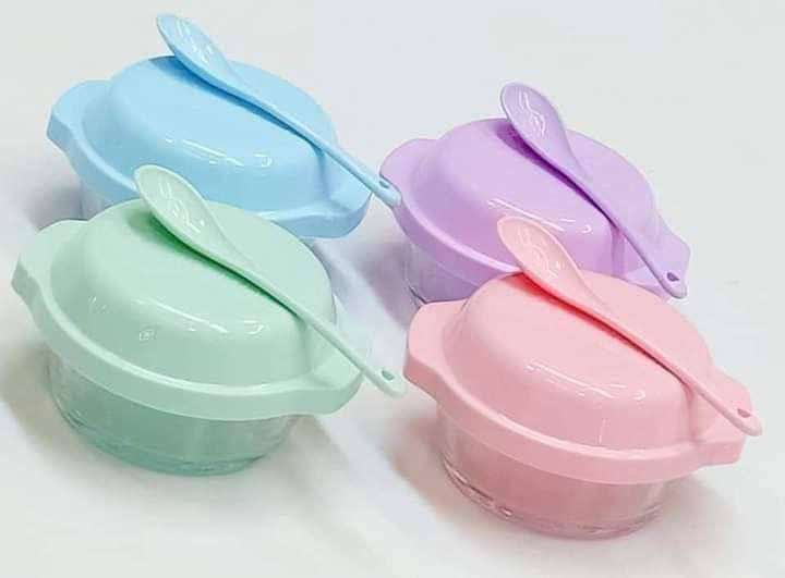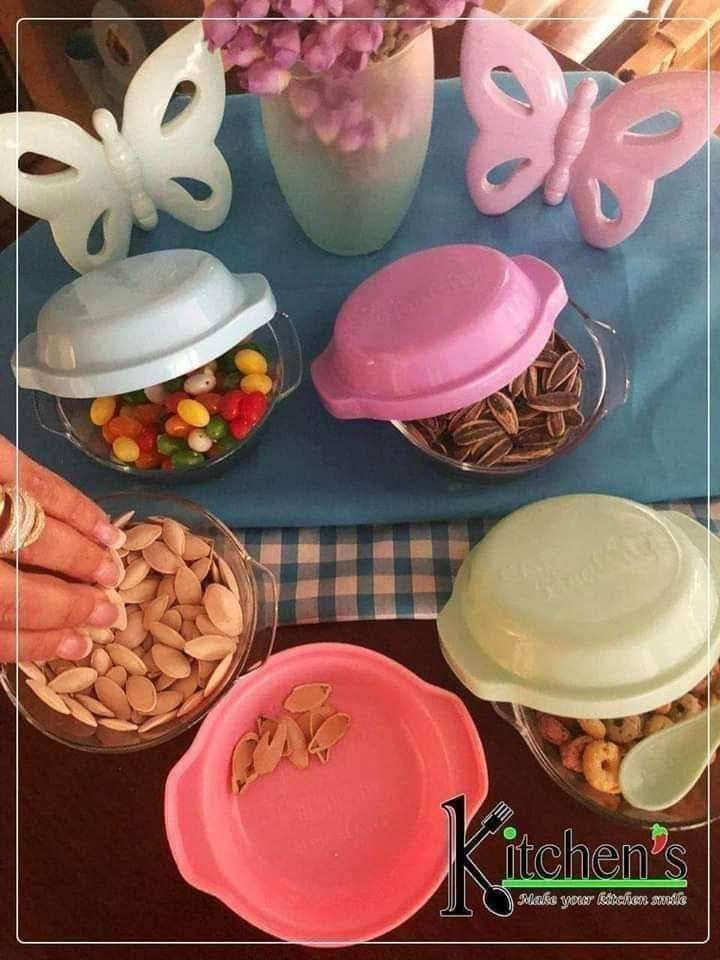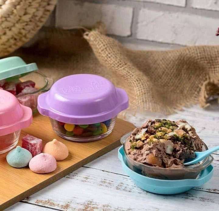 مكون من ١٢قطعه اربع بولات زجاج مدوره بغطا بلاستيك غويط ومعالق وكمان بيدخل الميكرويف الطقم في كرتونه شيك