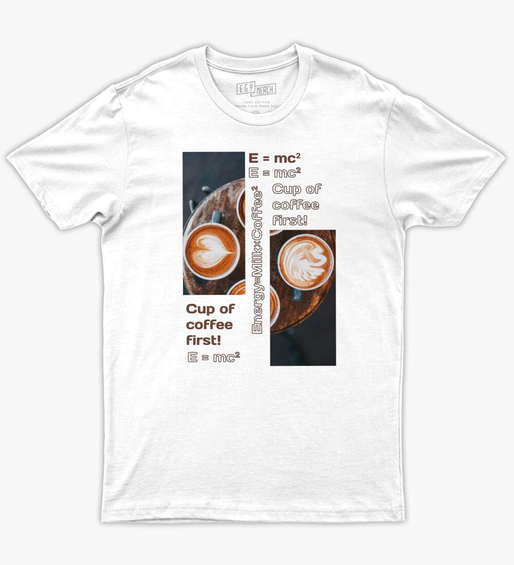تصميم مكون من صورة بها أكواب من القهوة باللبن بها لاتيه آرت ويحتوي كلمات وجمل ومعادلات مثل E = mc² Energy=Milk×Coffee² Cup of coffee first! مكتوبة بدرجات لون القهوة 🤎☕