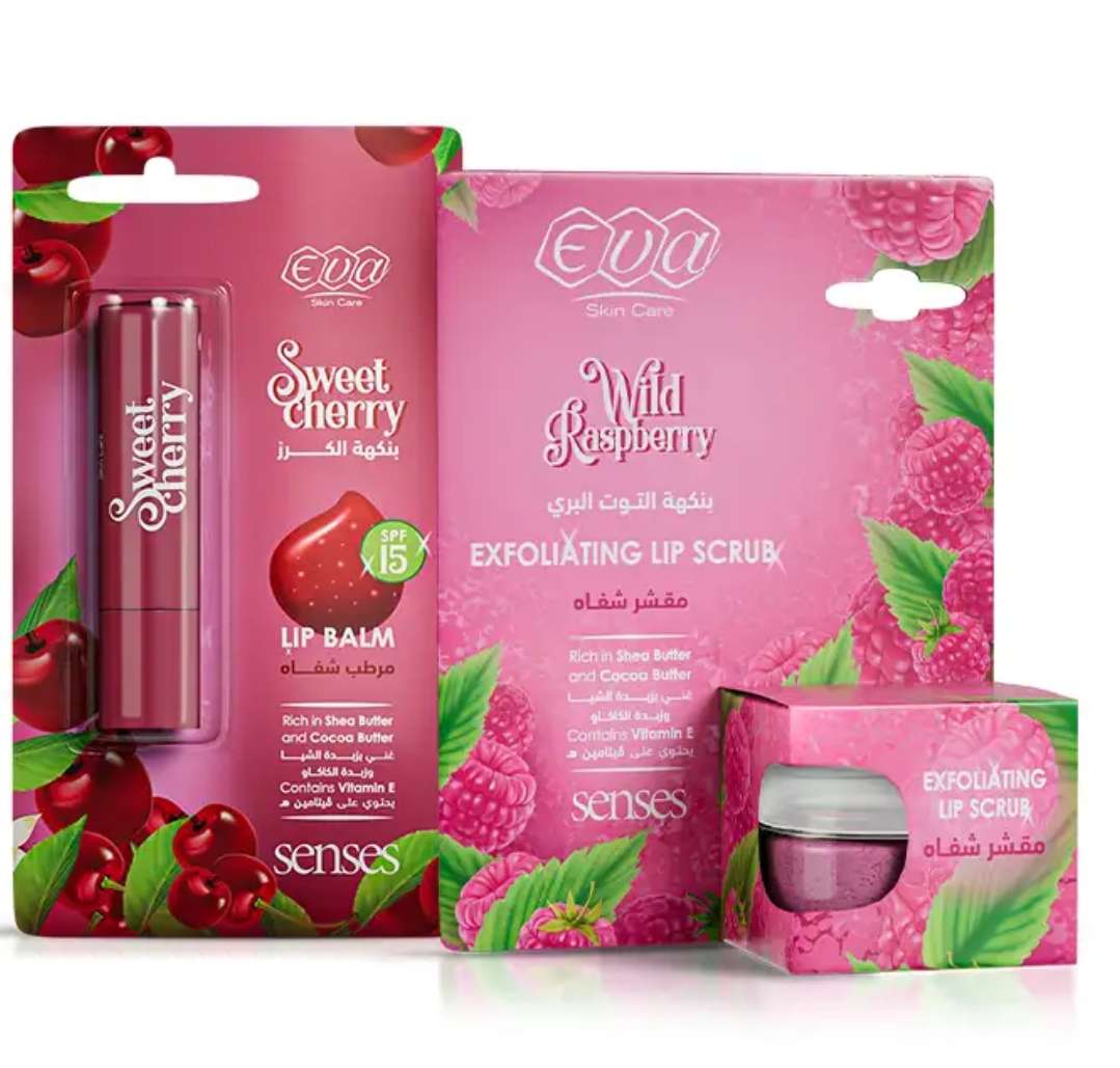 مجموعة إيڤا سكين كير للعناية بالشفاه – بنكهه الكرز الوصف إيڤا سكين كير سينز مرطب الشفاه بنكهه الكرز 4 جم + إيڤا سكين كير مقشر الشفاه بنكهة التوت البري 20 جم ليب بالم والمقشر
