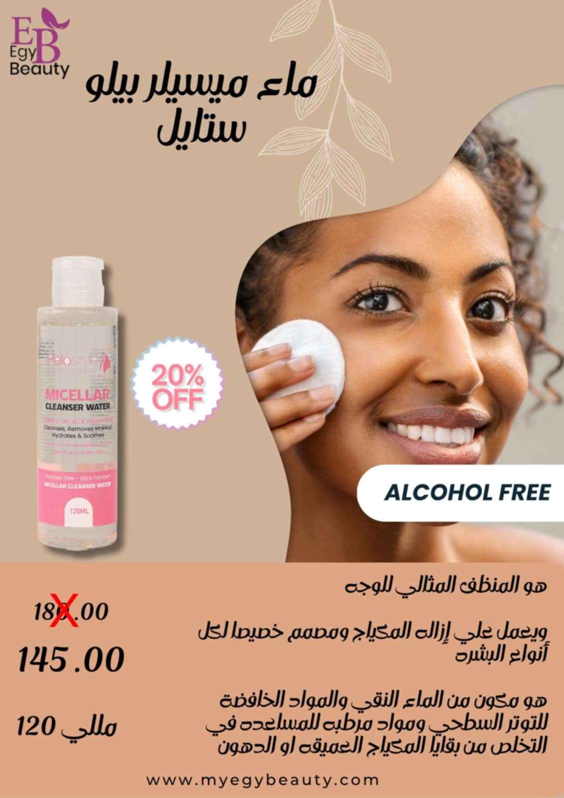 المنتج الأول هو ماء ميسلر هو المنظف المثالي للوجه ويعمل علي إزاله المكياج ومصمم خصيصا لكل أنواع البشره هو مكون من الماء النقي والمواد الخافضة للتوتر السطحي ومواد مرطبه للمساعده في التخلص من بقايا