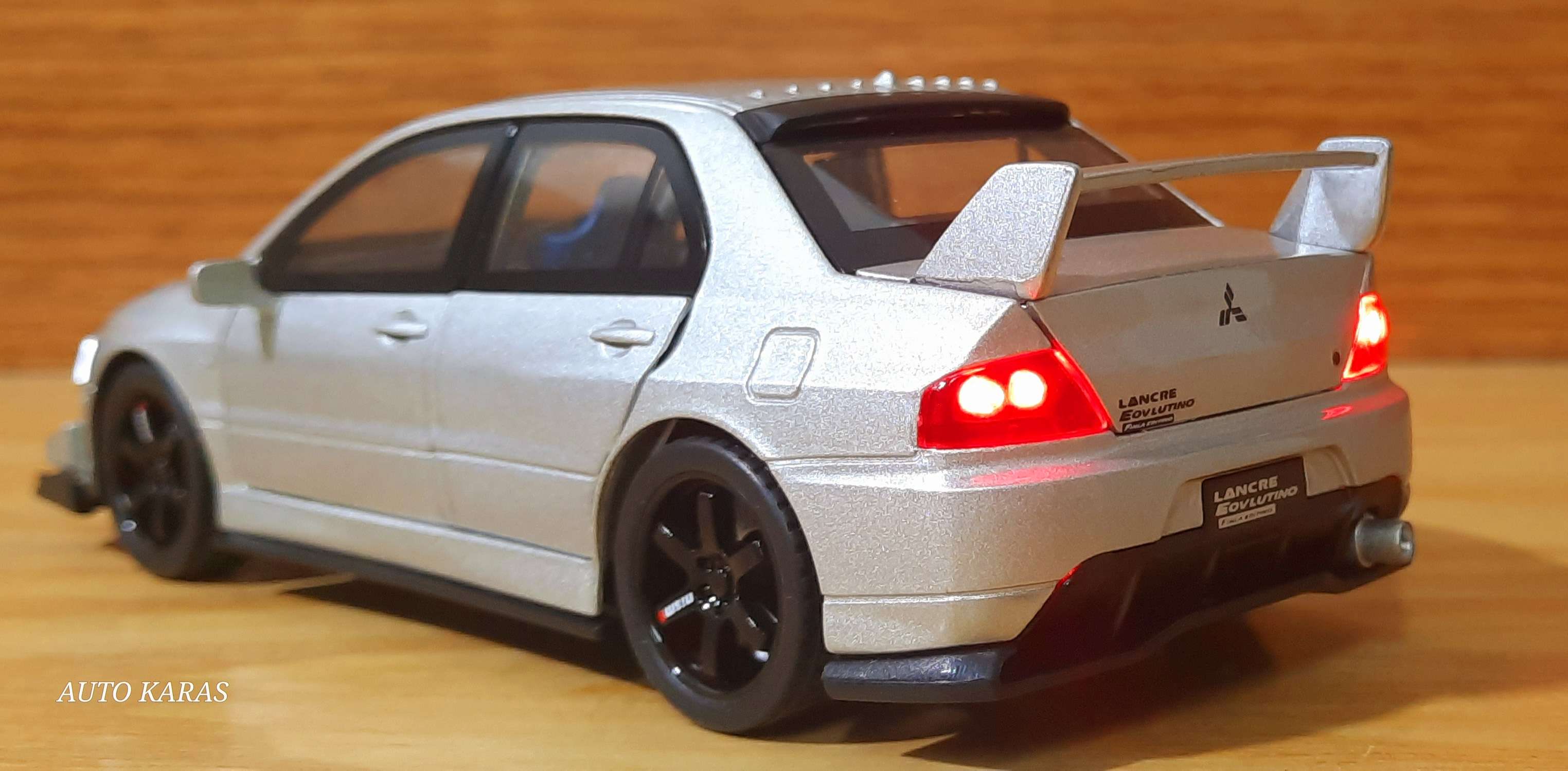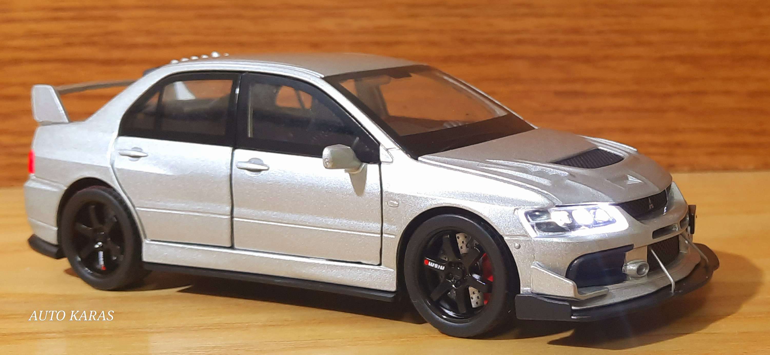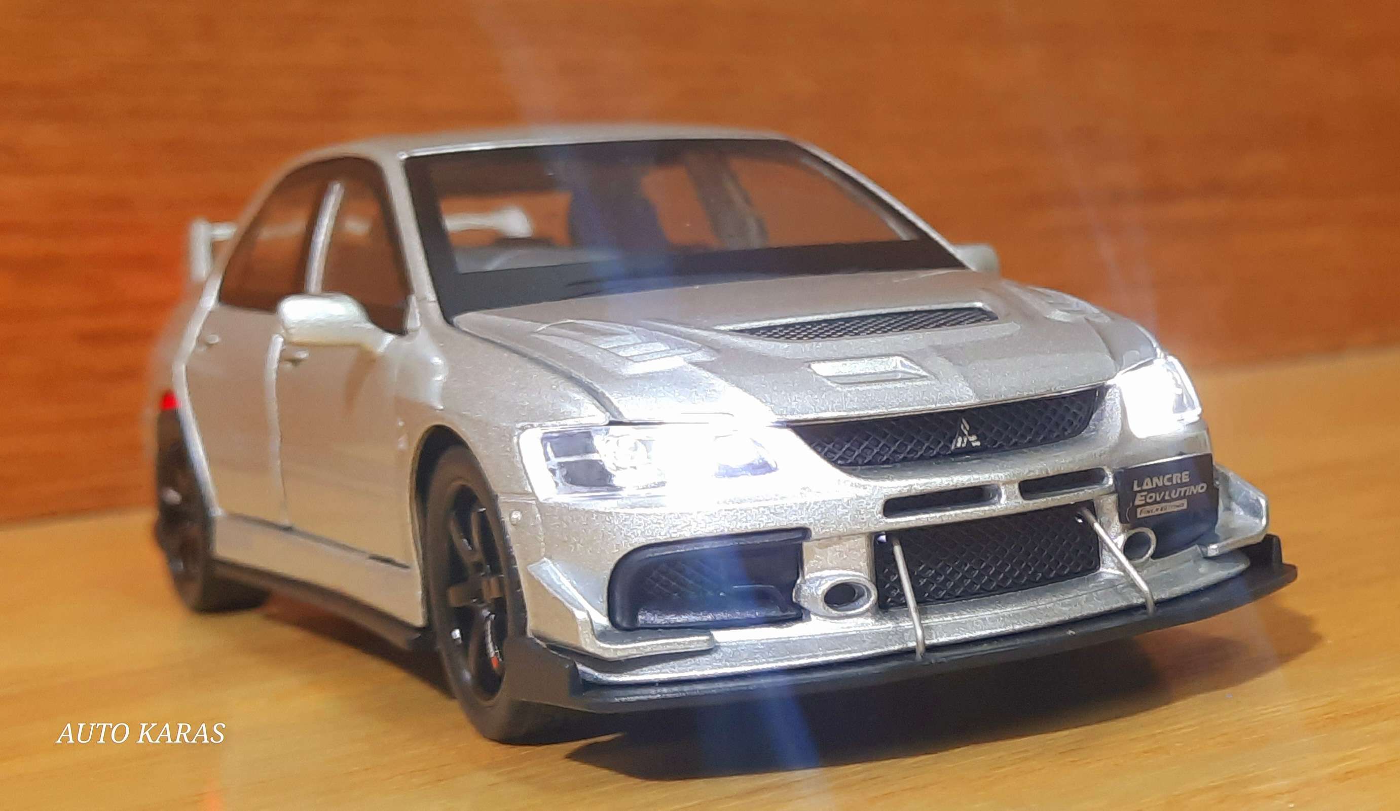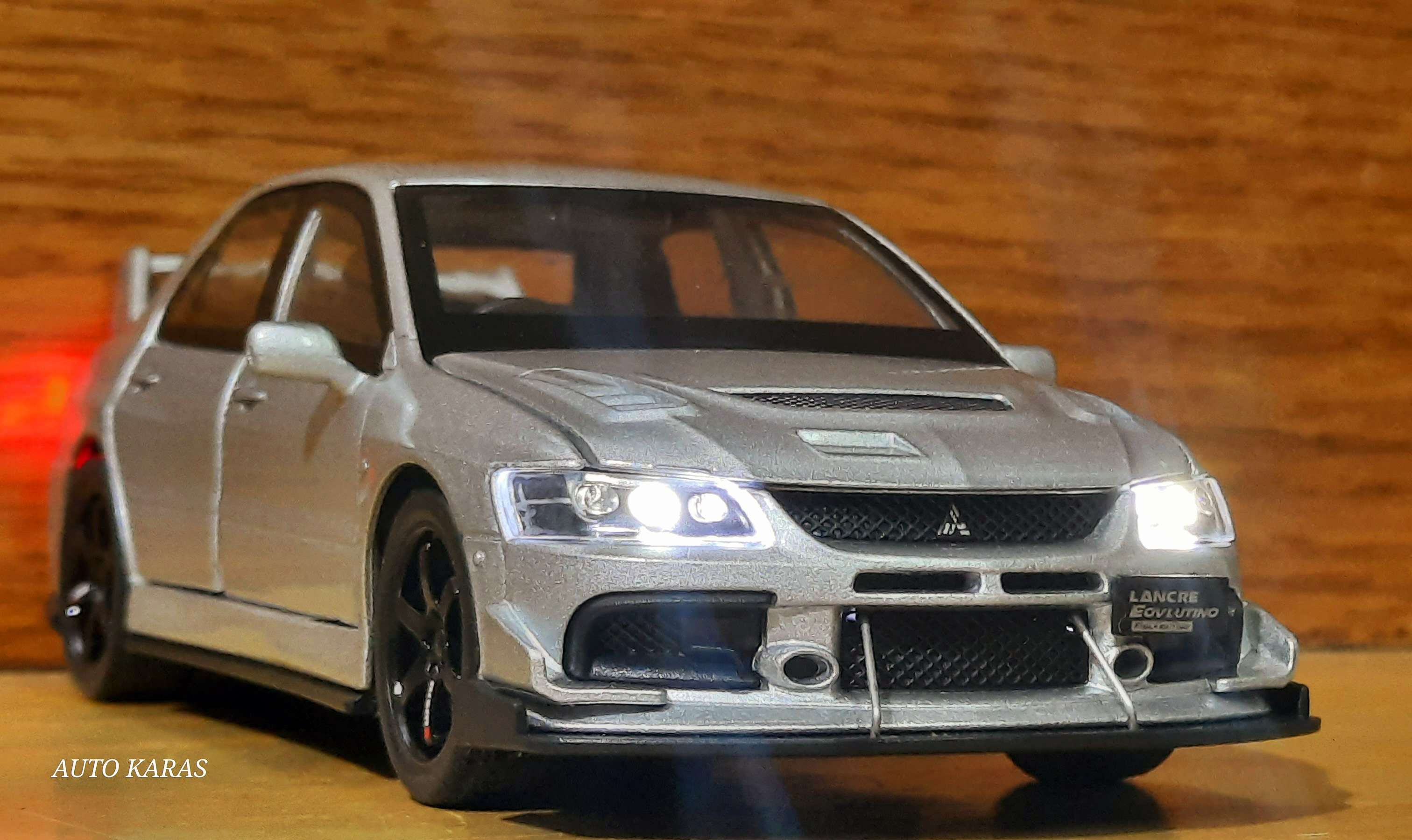 MITSUBISHI EVOLUTION خامة معدن تفاصيل ممتازة فتح 4 أبواب وكبوت وشنطة إضائة فوانيس أمامية وخلفية صوت موتور __ وصوت لوك أبواب كراسي متحركة __ كاوتش متحرك مقاس 16 cm