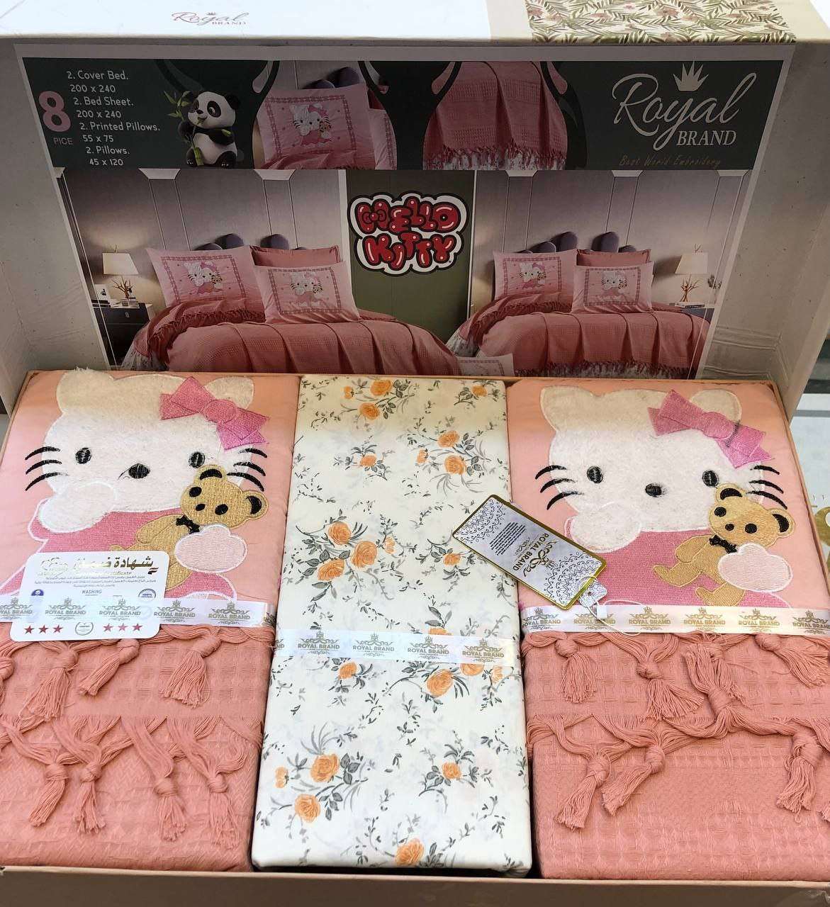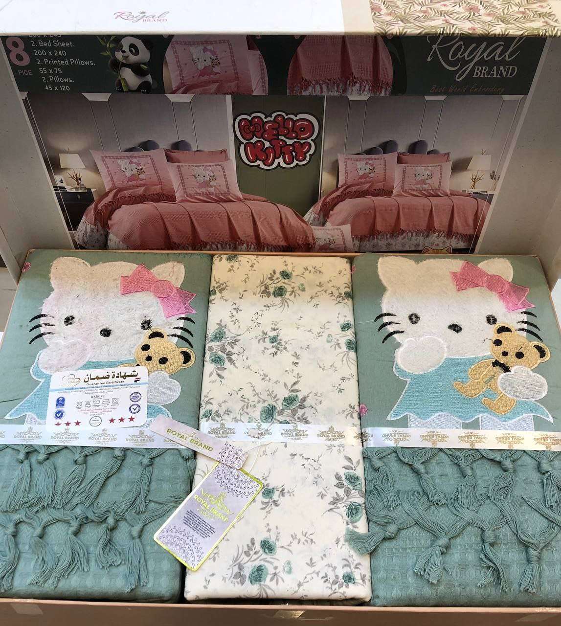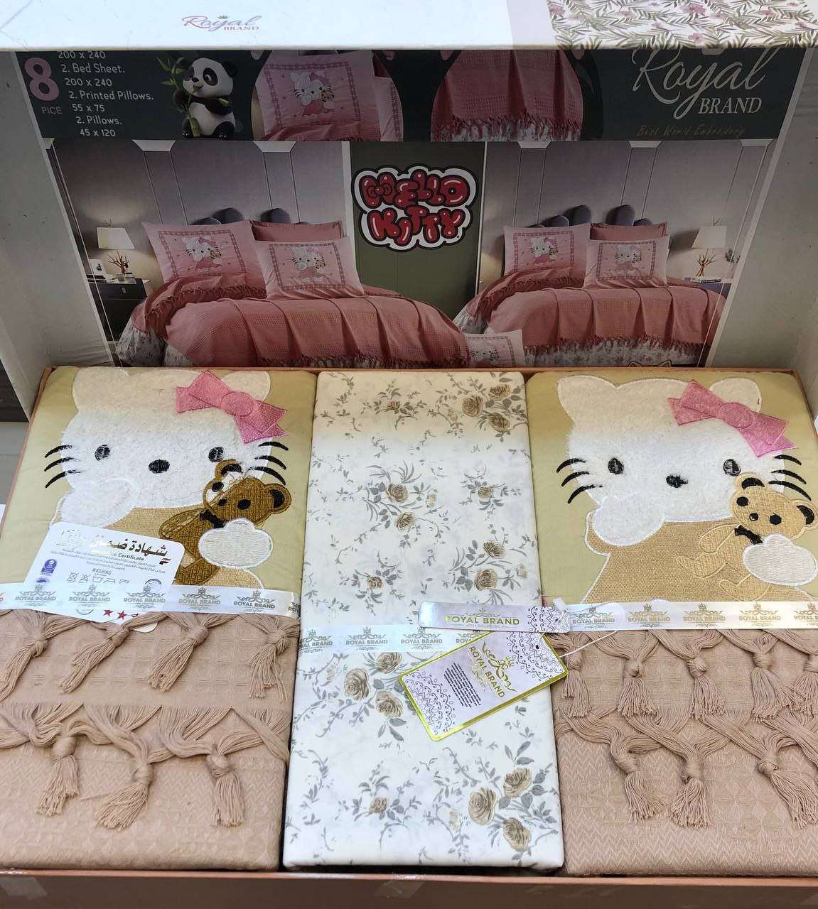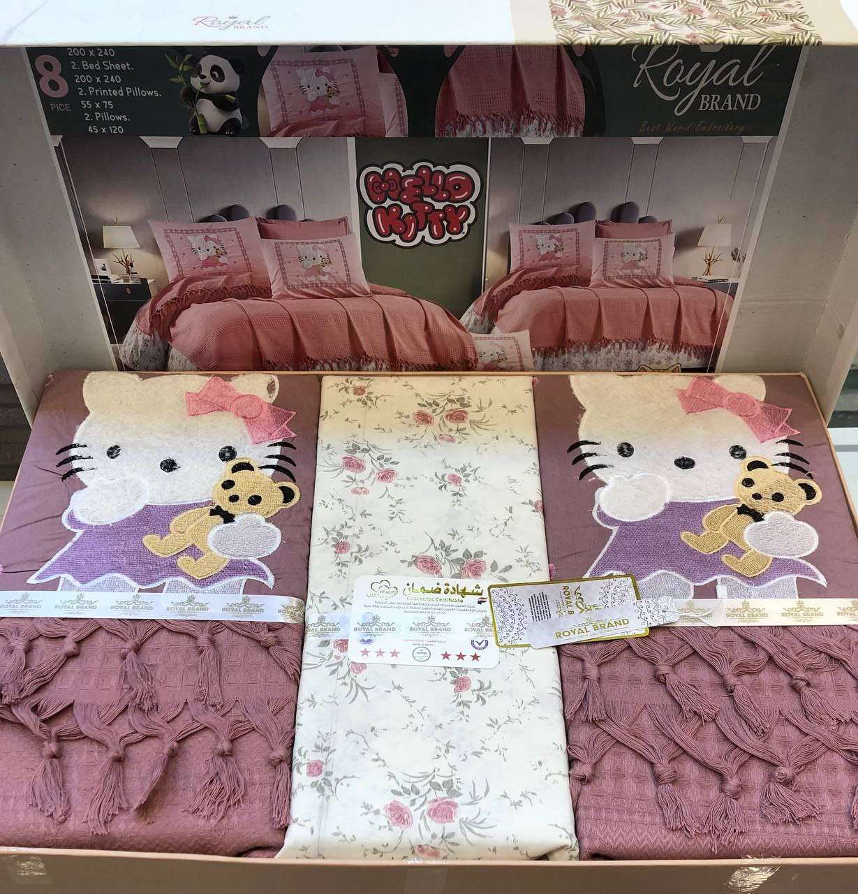 🌼 طقم رويال بكوفرتة بيكا شراشيب موديل كيتي اطفال🥰🥰🥰 8 قطع 2 ملاية مقاس200*240 2 كوفرتة مقاس 200*240 2 كيس مخده مقاس45*120🌟 2 خداديه مقاس60*70🌟 السعر 1500 ج