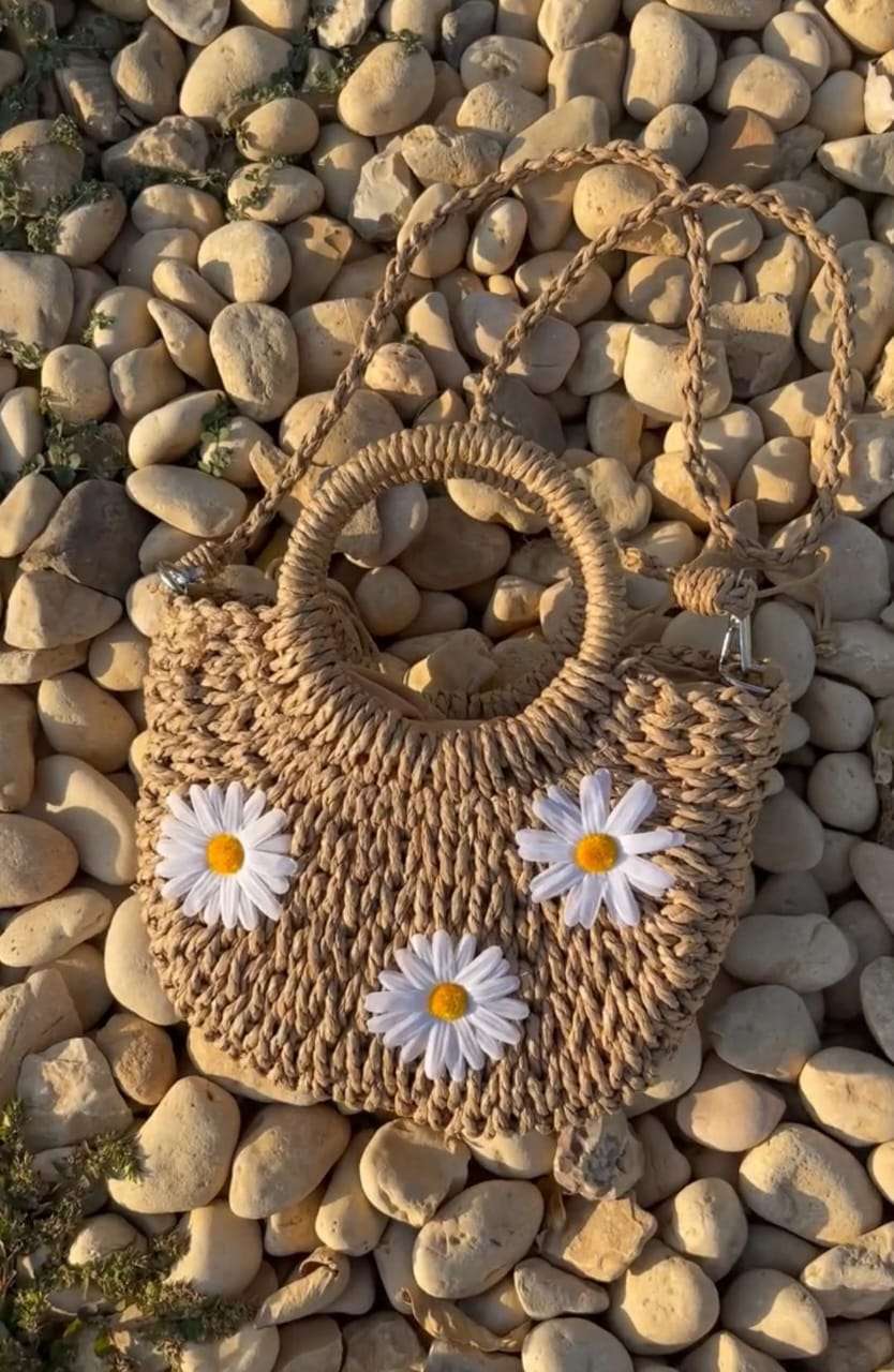 شنطه بخيط الرافيا المستورد مع يد خشبيه بغرزه مميزه مع لمسه من زهور تضيف طابع مميز ومبهج