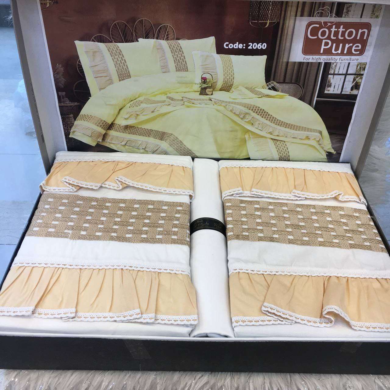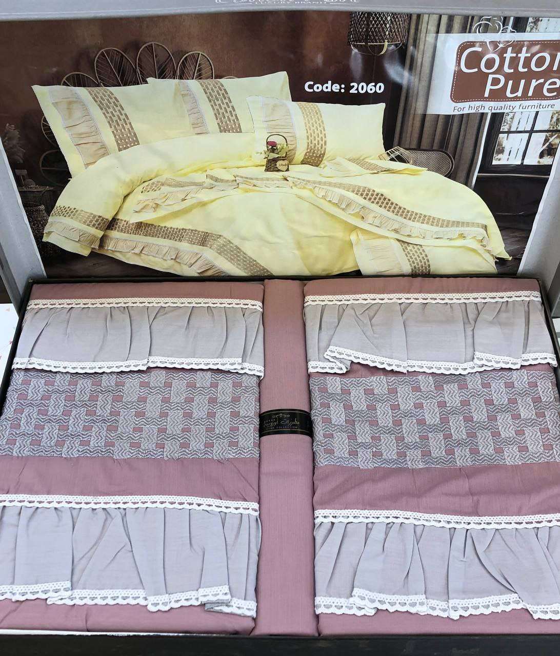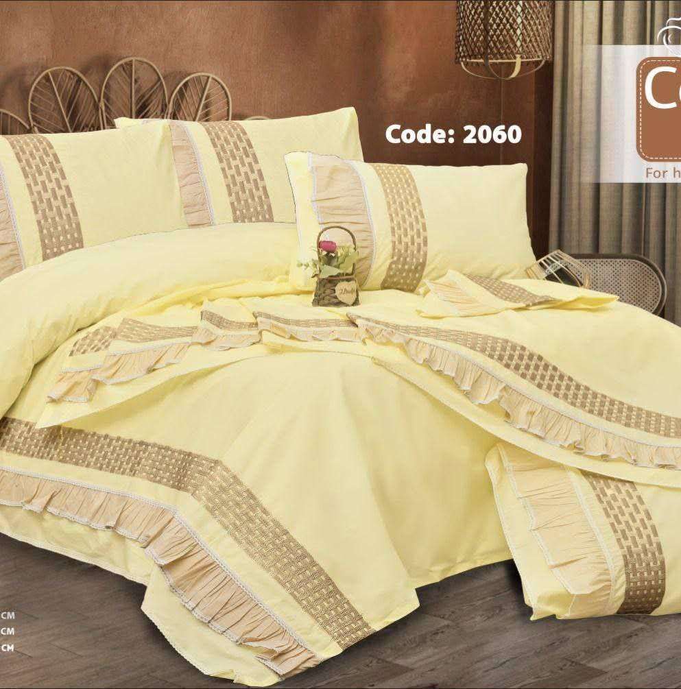 عيشي أجواء الأناقة الأوروبية كل يوم مع طقم السرير الكبير موديل 2060 💛 تصميم فاخر من القطن الصافي 100% وتطريزات ناعمة، 4 قطع (ملاية 240×260، كيس مخدة طويل، 2 خدادية) تمنح سريرك لمسة فندقية ونعو