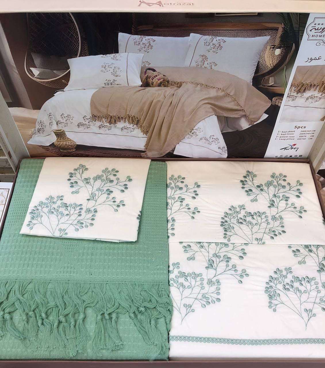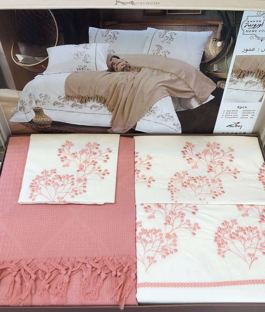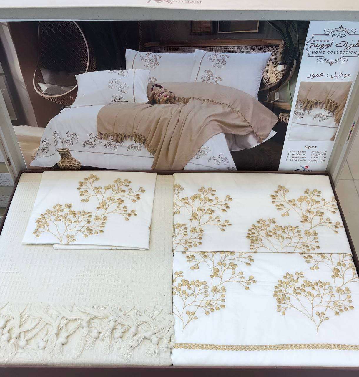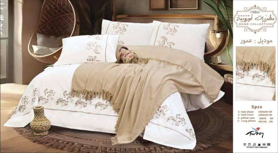 🌼 طقم سرير كبير + كوفرتة من مطرزات أوروبية موديل عمور 5 قطع 1 ملاية 240*260 1 كوفرتة 240*240 2 خدادية 55*75 1 مخدة 45*160 السعر 1330