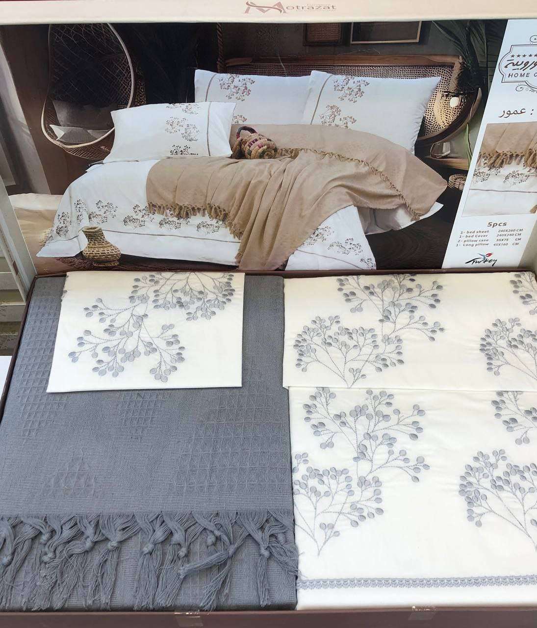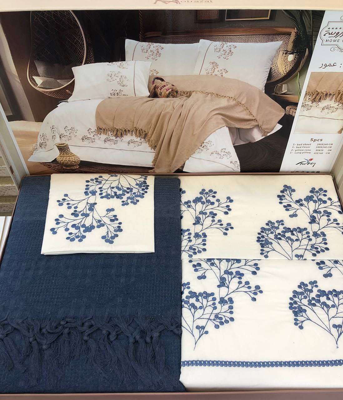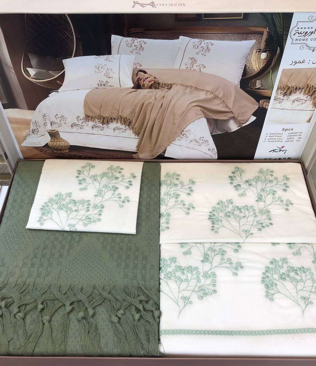 🌼 طقم سرير كبير + كوفرتة من مطرزات أوروبية موديل عمور 5 قطع 1 ملاية 240*260 1 كوفرتة 240*240 2 خدادية 55*75 1 مخدة 45*160 السعر 1330