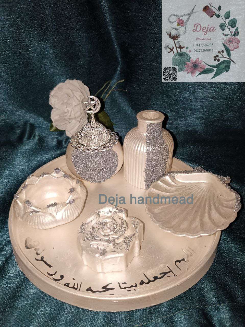 طقم كونكريت سلفر عباؤه عن (مبخره بغطا وطبق معدن + فازه + صينيه متاح عليها طباعة اي جمله + طفايه + صدفه + ورده ) متاح تغيير الالوان والديزاين وطباعة اسامي