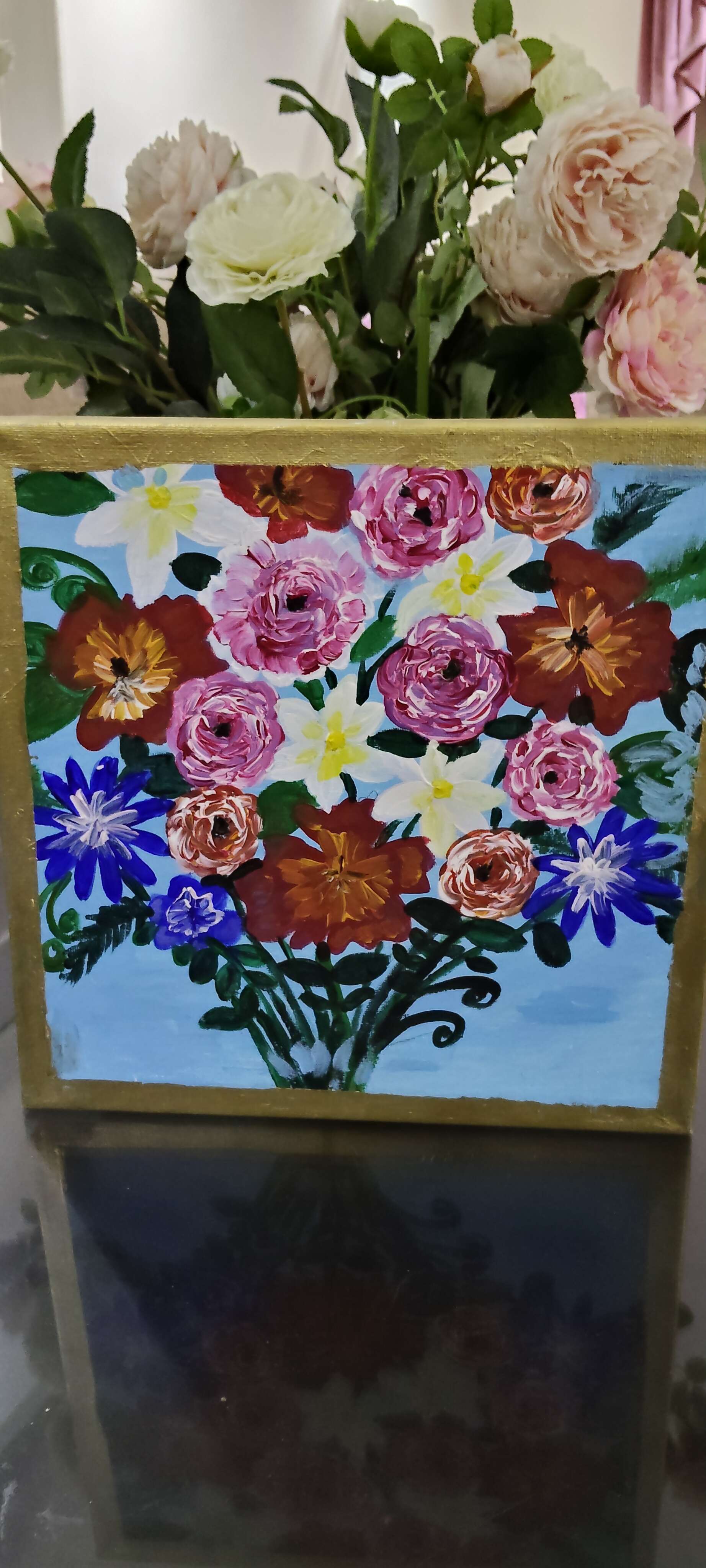 تابلوه هاند ميد رقيق باقة ورود متحدد بدهان دهبي مربع مقاس ٢٥