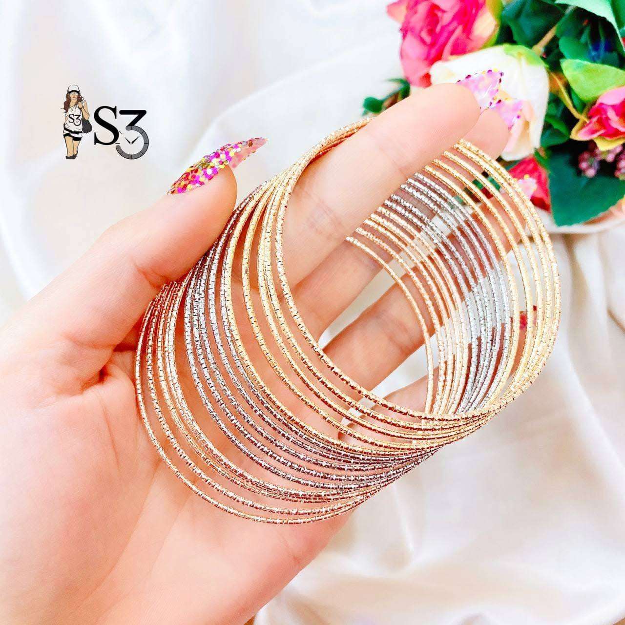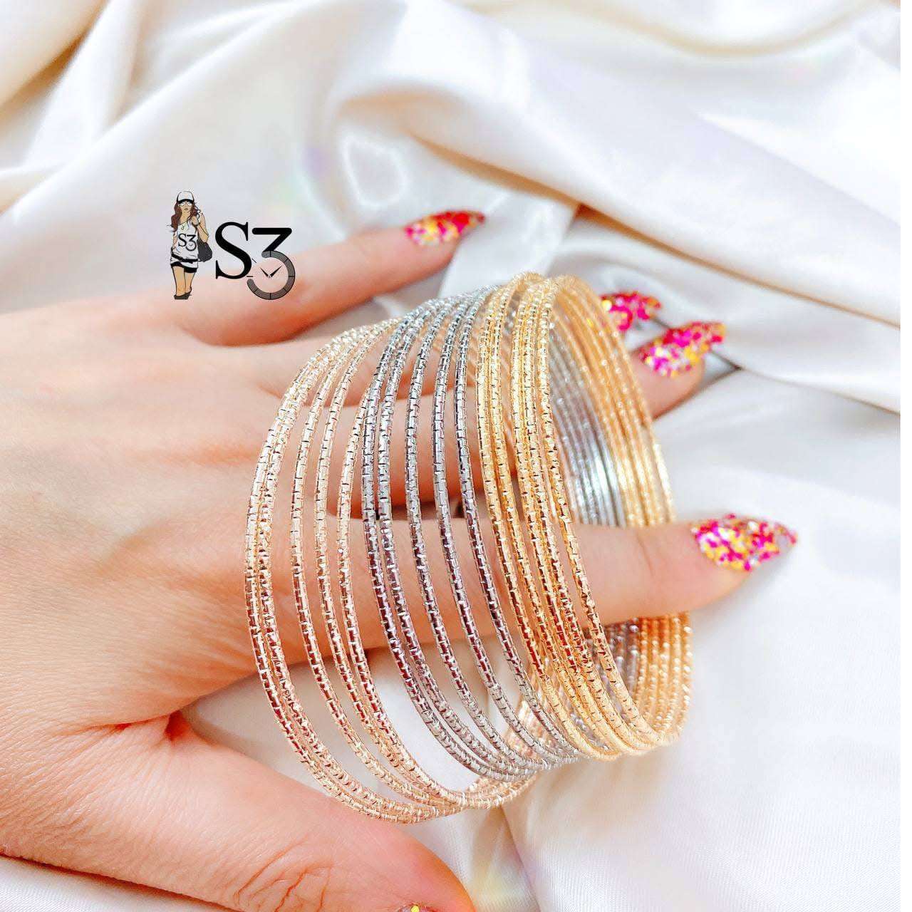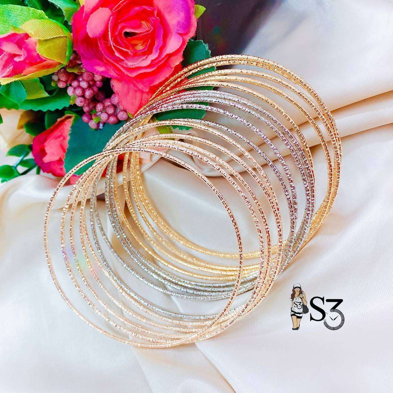 نقدم لكم طقم الغوايش المتكامل: 12 غويشة أنيقة تجمع بين سحر الذهب الأصفر، رومانسية الذهب الأحمر، وفخامة السيلفر. 4 قطع من كل لون لتتألقي بمزيج فريد يكمل كل إطلالاتكِ، من الكلاسيكي إلى العصري. لا تفوتي