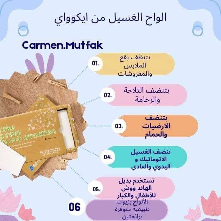 ح الغسيل من إيكو واي هي بديل صديق للبيئة للمنظفات التقليدية، وهي عبارة عن شرائح صغيرة مركزة وقابلة للتحلل البيولوجي تزيل البقع بفعالية في جميع أنواع الغسالات، بما في ذلك الغسالات ذات الكفاءة العالية.