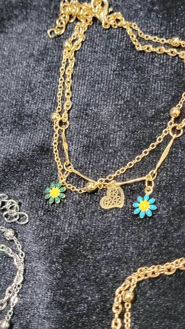 طبقتان من السلاسل الذهبية اللامعة بتفاصيل دقيقة، تلتف برقة حول الكاحل. مزين بدلايات ساحرة على شكل: زهرتان صغيرتان بألوان زاهية ومبهجة (أخضر وأزرق) تضفي لمسة من الحيوية والمرح. دلاية قلب أنيقة بتصميم م