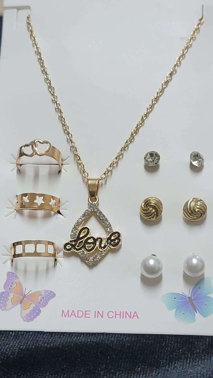 سلسلة LOVE مرصعة + 3 خواتم + 3 حلقان