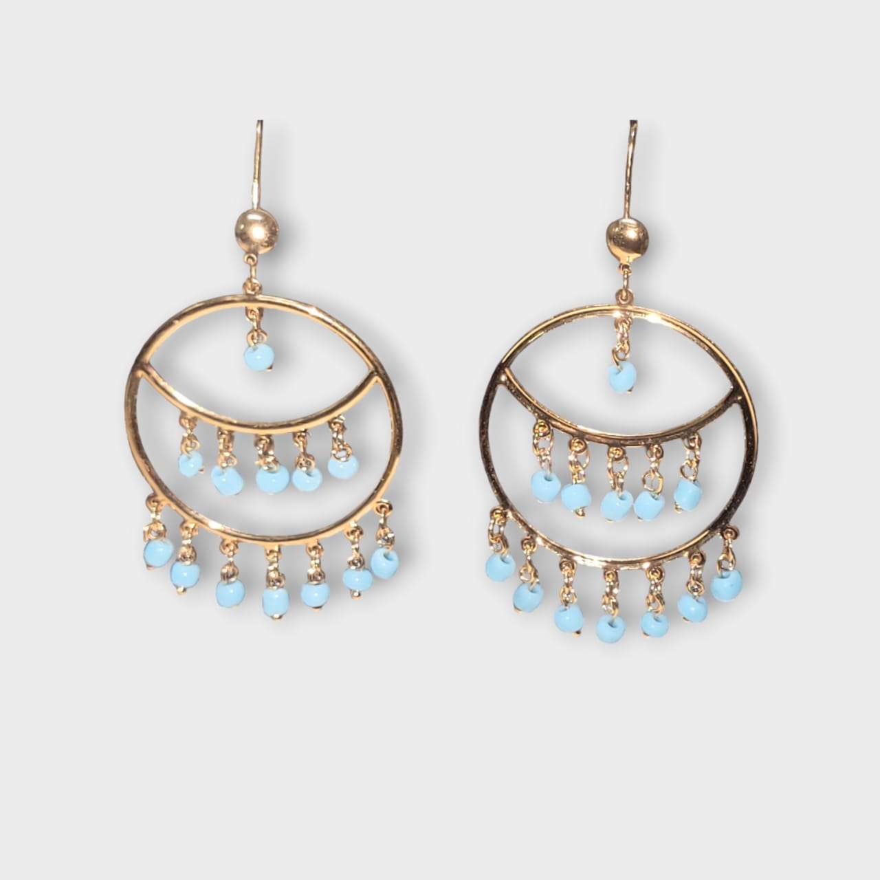 تصميم هلالي مزدوج: شكل دائري مفتوح من الأعلى (يشبه الهلال)، مع طبقة داخلية تحمل سلاسل متدلية.لون ذهبي لامع: الإطار المعدني باللون الذهبي البراق، يضفي لمسة من الرقي والفخامة.خرز أزرق سماوي ناعم: مزينة