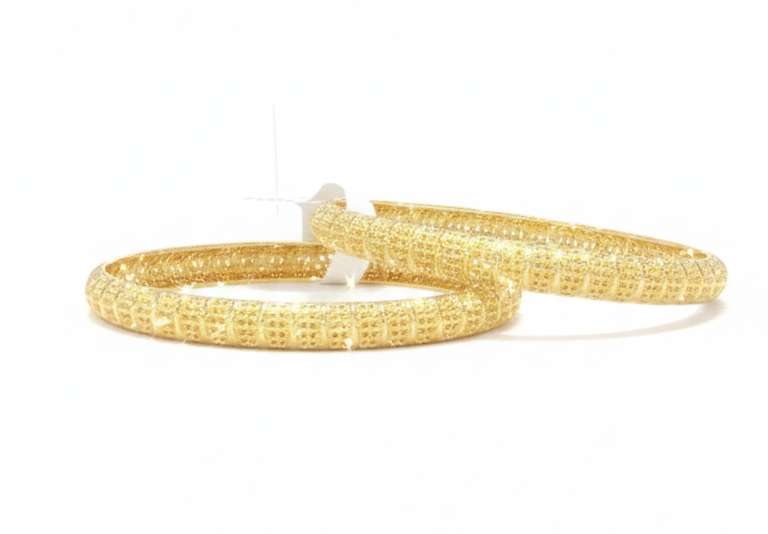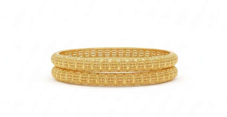 غوايش ذهبية بتفاصيل منقوشة بدقة على شكل خطوط ناعمة تبرز جمال التصميم وتمنحه لمسة فنية أنيقة. تأتي في طقم من قطعتين يمكن ارتداؤهما معًا أو كل واحدة على حدة لإطلالة أكثر تنوعًا. تجمع بين الرقة والذوق ال