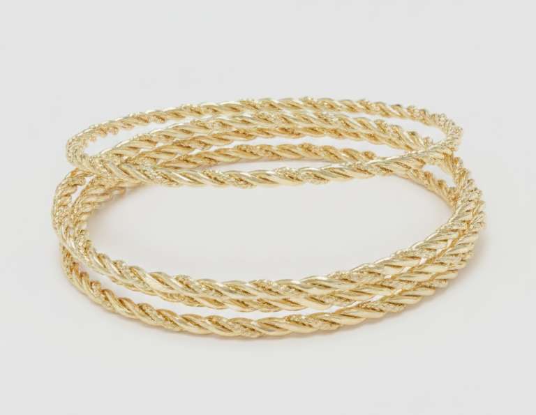 مجموعة من الأساور الذهبية الرقيقة والناعمة، مكونة من قطعتين . تتميز بتصميم مجدول (ضفيرة) كلاسيكي وأنيق. هذه الأساور ذات مظهر متناسق ومتين، يمكن ارتداؤها منفردة لمسة بسيطة أو معاً لتكوين مظهر متراكم وج