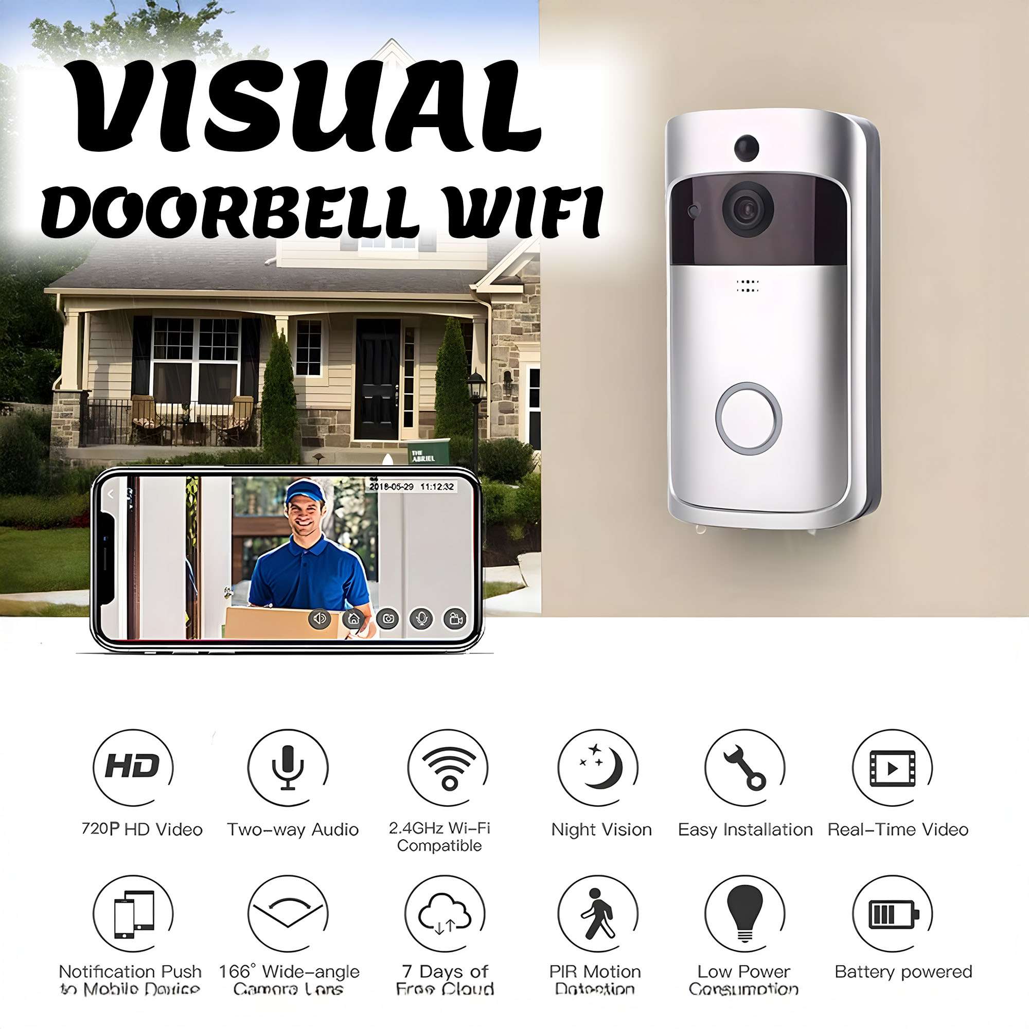 "خلك دايمًا على علم بمن يطرق بابك، حتى لو ما كنت فالبيت! جرس الباب الذكي Visual Doorbell WiFi يعطيك راحة بال وأمان فكل وقت ومكان. 🏡📱"راحة بالك تبدأ من باب بيتك! 📹🔔💡 مميزات المنتج: 1️⃣ كاميرا عال