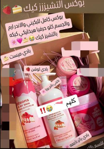 بوكس كامل بيكيني والاندر ارم والجسم كله . لوشن اتشيز كيك . اسبلاش تشيز كيك . بيكيني بتر تشيز كيك . معطر للبكيني بليه . 2مخمريه