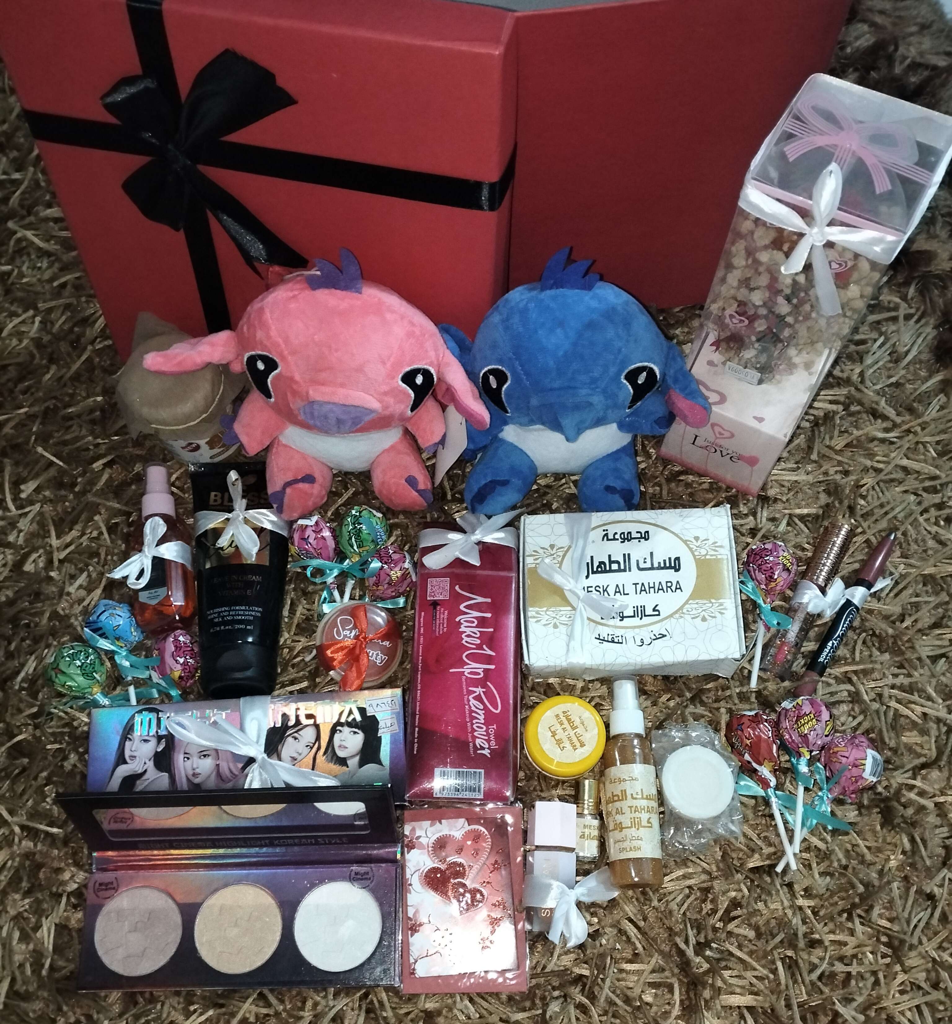 بوكس هدايا بناتي ميكاب و هديه دبدوب ستيتش و انجل و مصاصات و ورد