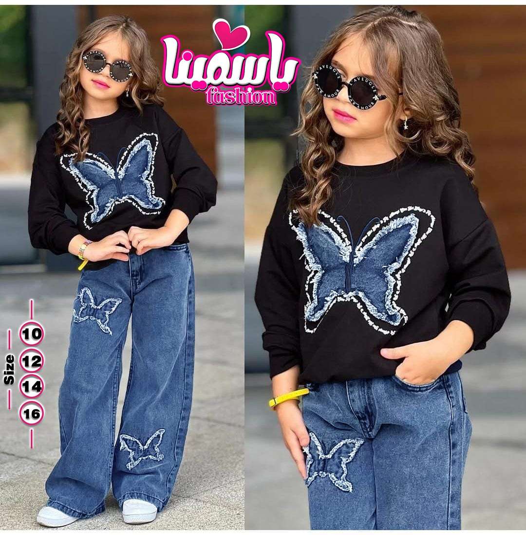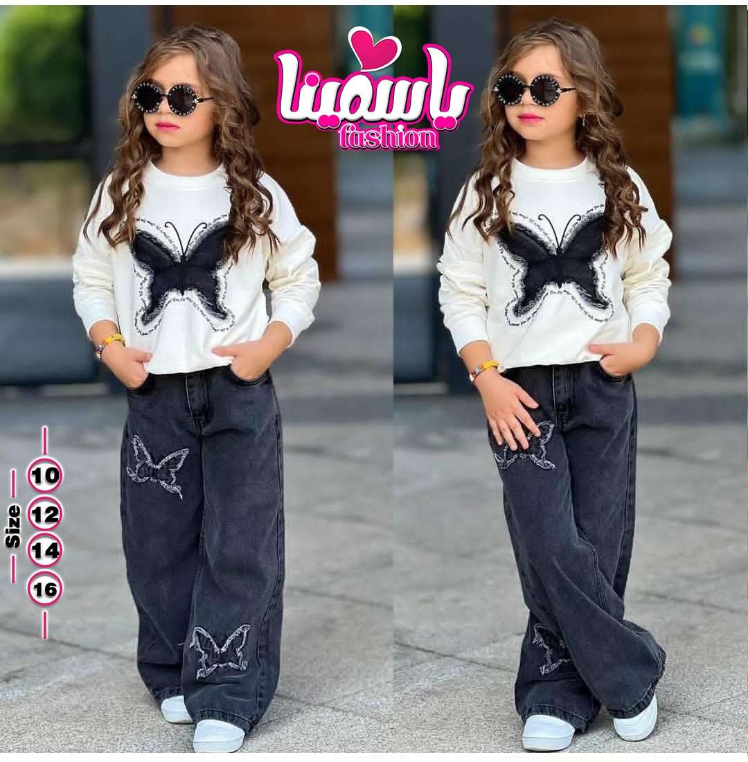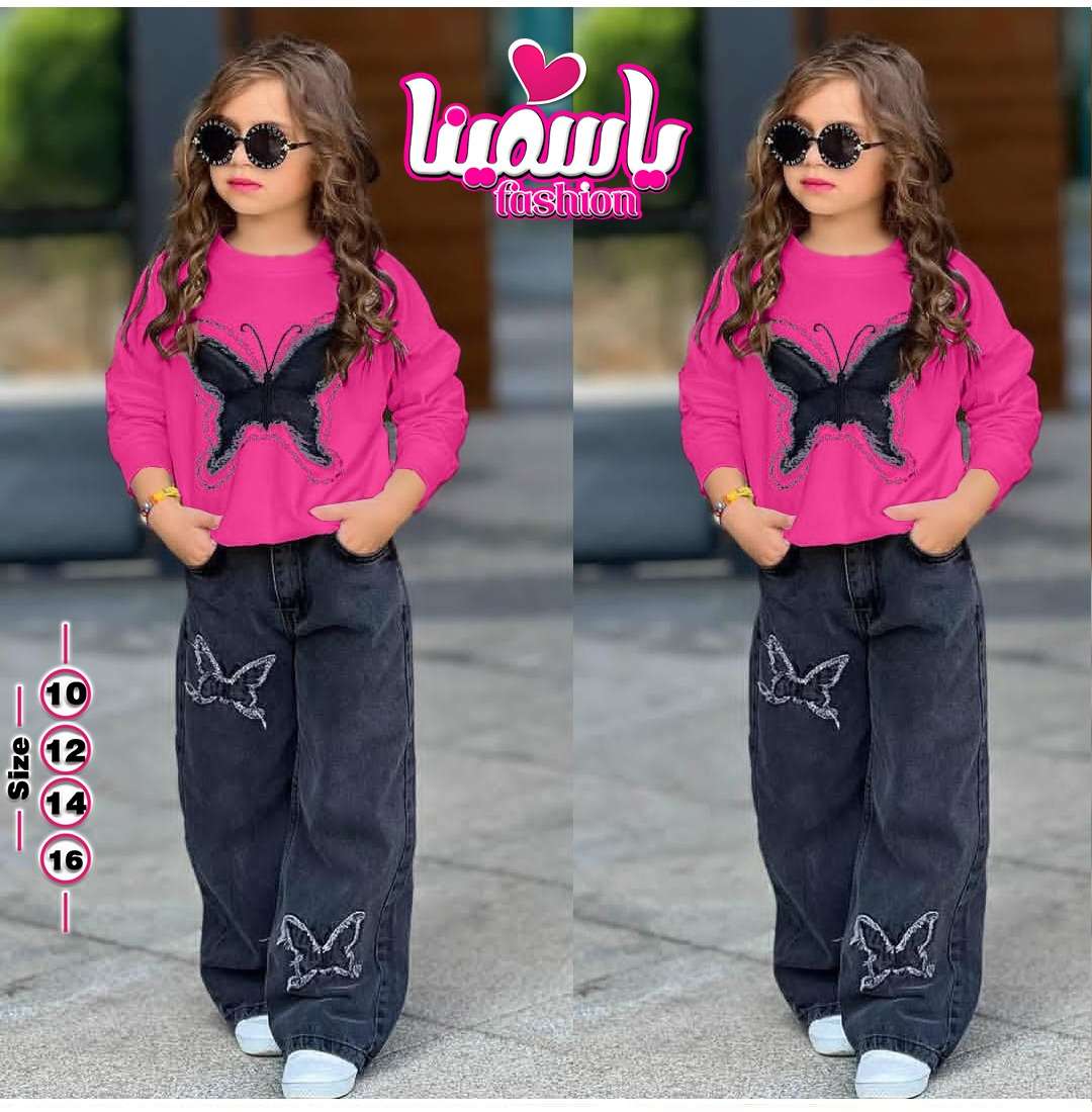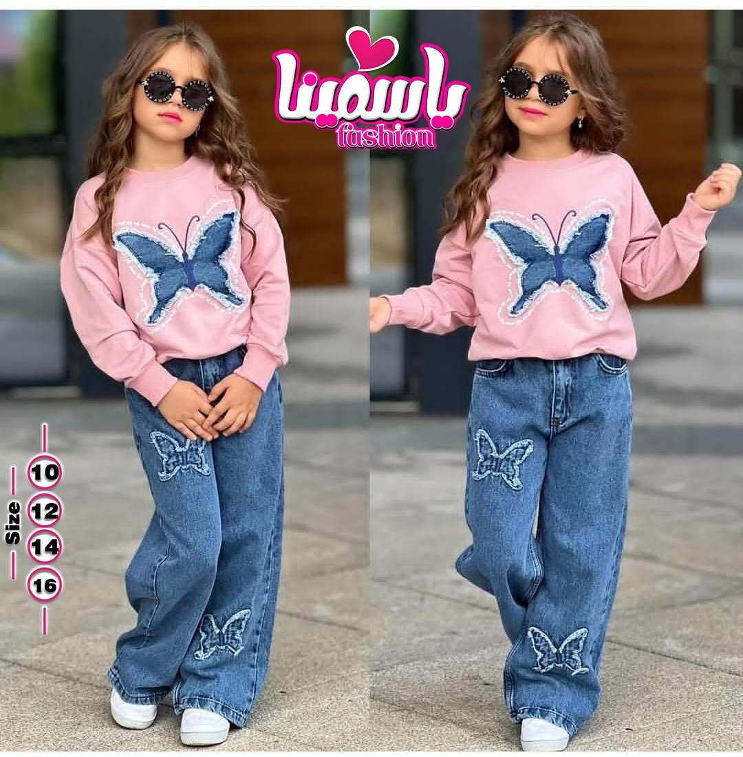 *طقم بناتي محير فراشات🥰 للاعياد والخروجات💖💖*ح *طقم خروج مكون من تشيرت ملتون قطن💯77ح تطريز فراشه جينز من نفس خام البنطلون زي الصوره ❤️ 🔥وبنطلون جينز رباعي 11ونص اونز مطعم بالفراشات الليزر زي