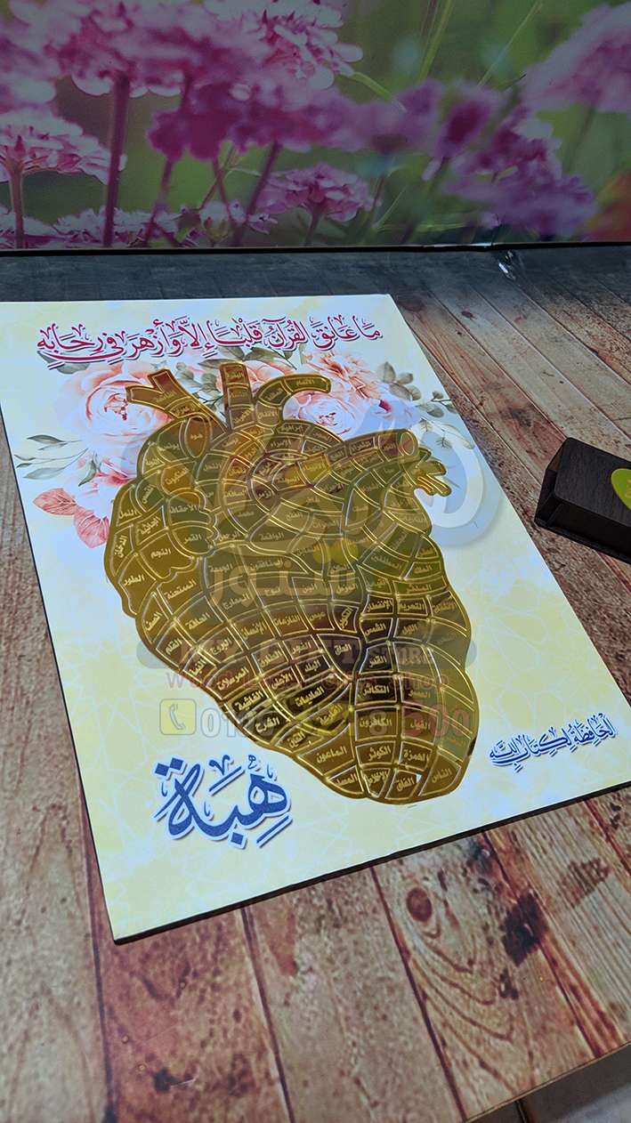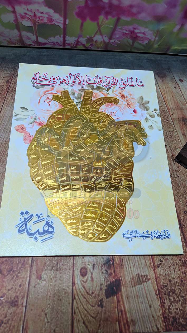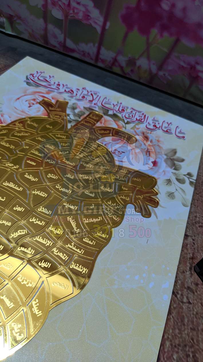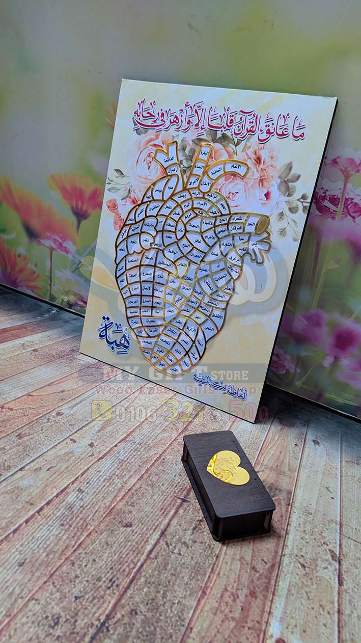 تابلوه خشب قلب حفظ القرآن الكريم مقاس 30 * 40 سم + بوكس محفور عليه الاسم يحتوى على أسماء السور محفورة على الذهبى اللامع
