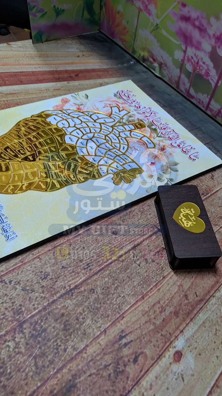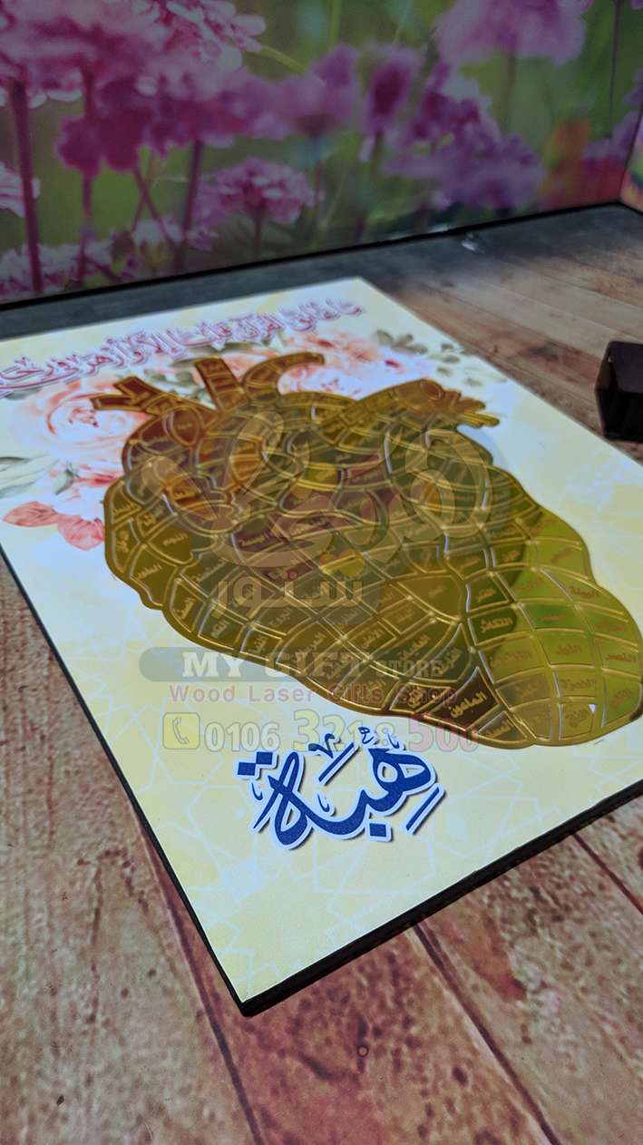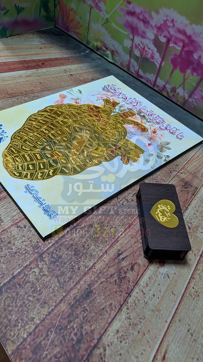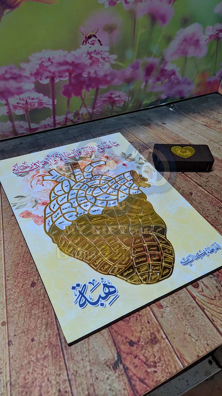 تابلوه خشب قلب حفظ القرآن الكريم مقاس 30 * 40 سم + بوكس محفور عليه الاسم يحتوى على أسماء السور محفورة على الذهبى اللامع