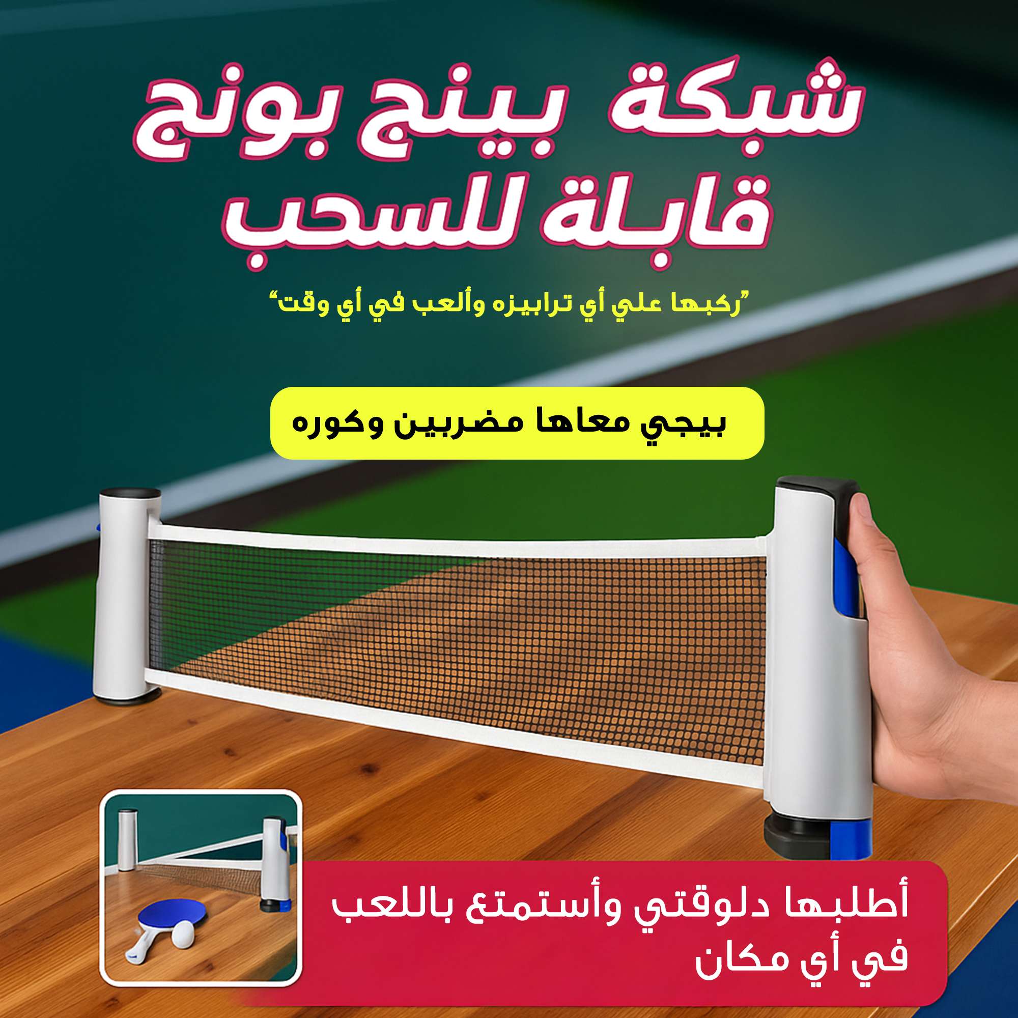 شبكة بينج بونج قابلة للسحب تناسب اي ترابيزة + مضربين + كره
