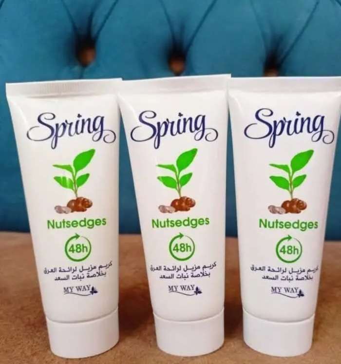 : كريم مزيل العرق سبرينج (Spring). العلامة التجارية: ماي واي (My Way). المكونات الأساسية: خلاصة نبات السعد. الفعالية: يوفر حماية من رائحة العرق تصل إلى 48 ساعة. الميزات الإضافية: يُعرف بقدرته على التف