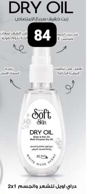 زيت ماي واي الجاف "Soft Skin Dry Oil" متعدد الأغراض للشعر والجسم برائحة المسك الأبيض. يتميز بتركيبة خفيفة وسريعة الامتصاص وغني بزيت الجوجوبا وفيتامين E. يعمل على ترطيب البشرة الجافة ويمنح الشعر لمعان