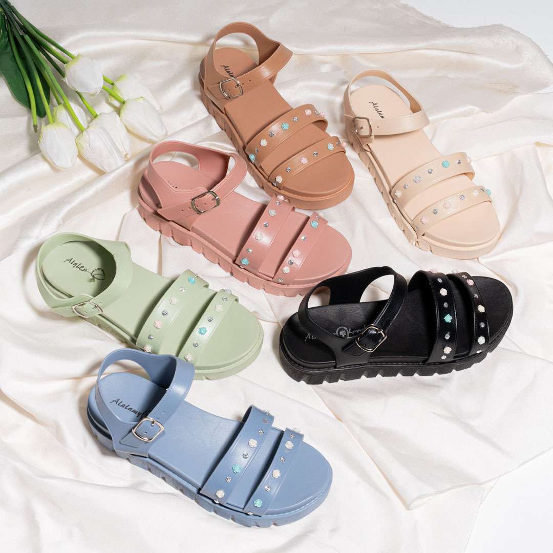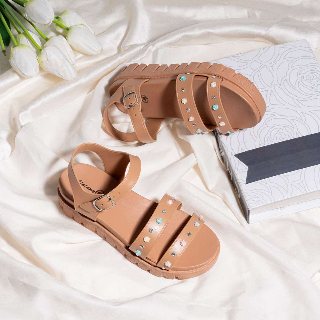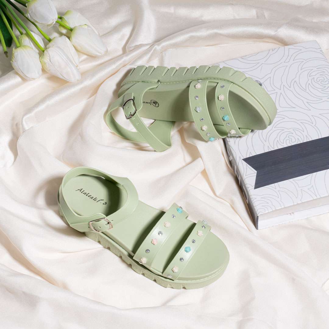 صندل بناتي عصري بخامة EVA مستورد عالية الجودة تصميم ثلاثي الأحزمة بثبات مريح ومظهر أنيق مزين بحليات دائرية تضيف لمسة عصرية ولمعان جذاب نعل عريض ومتين بسطح مانع للانزلاق مزود بإبزيم جانبي ق