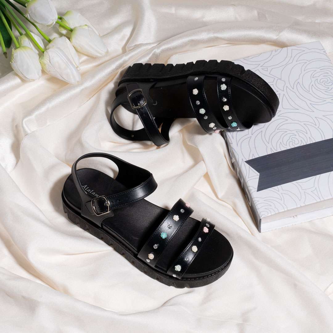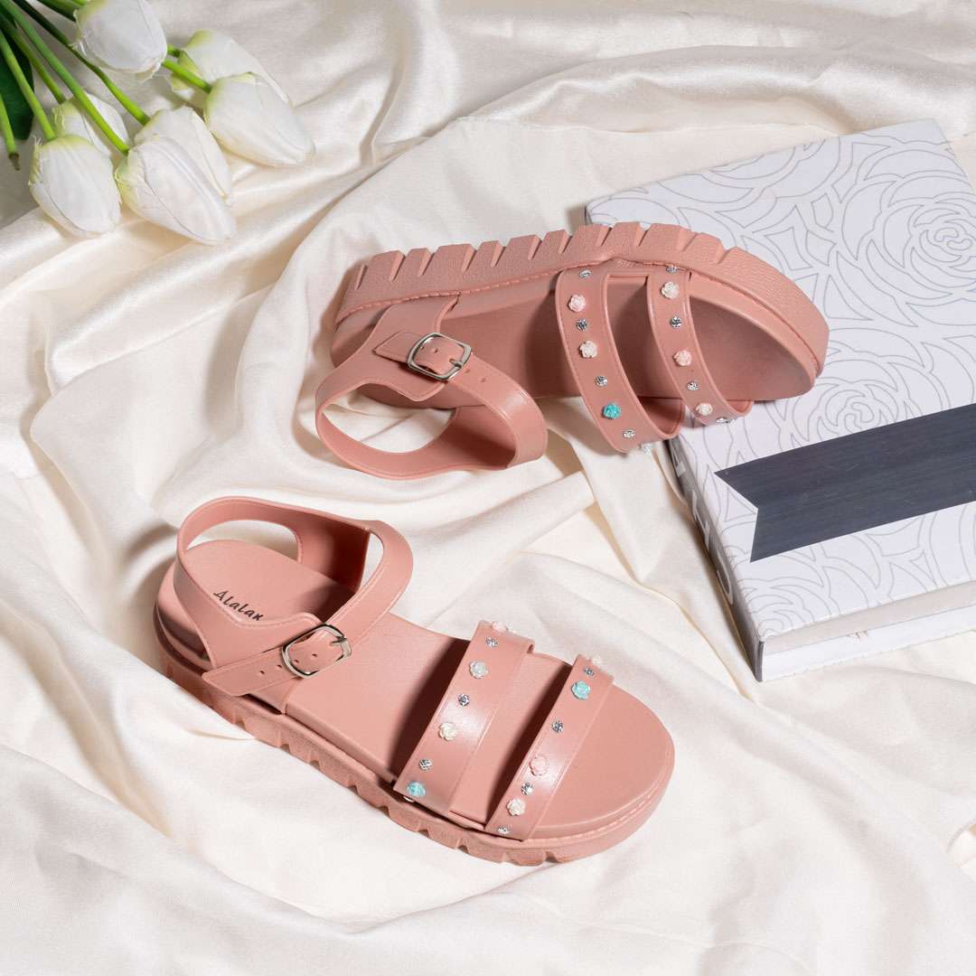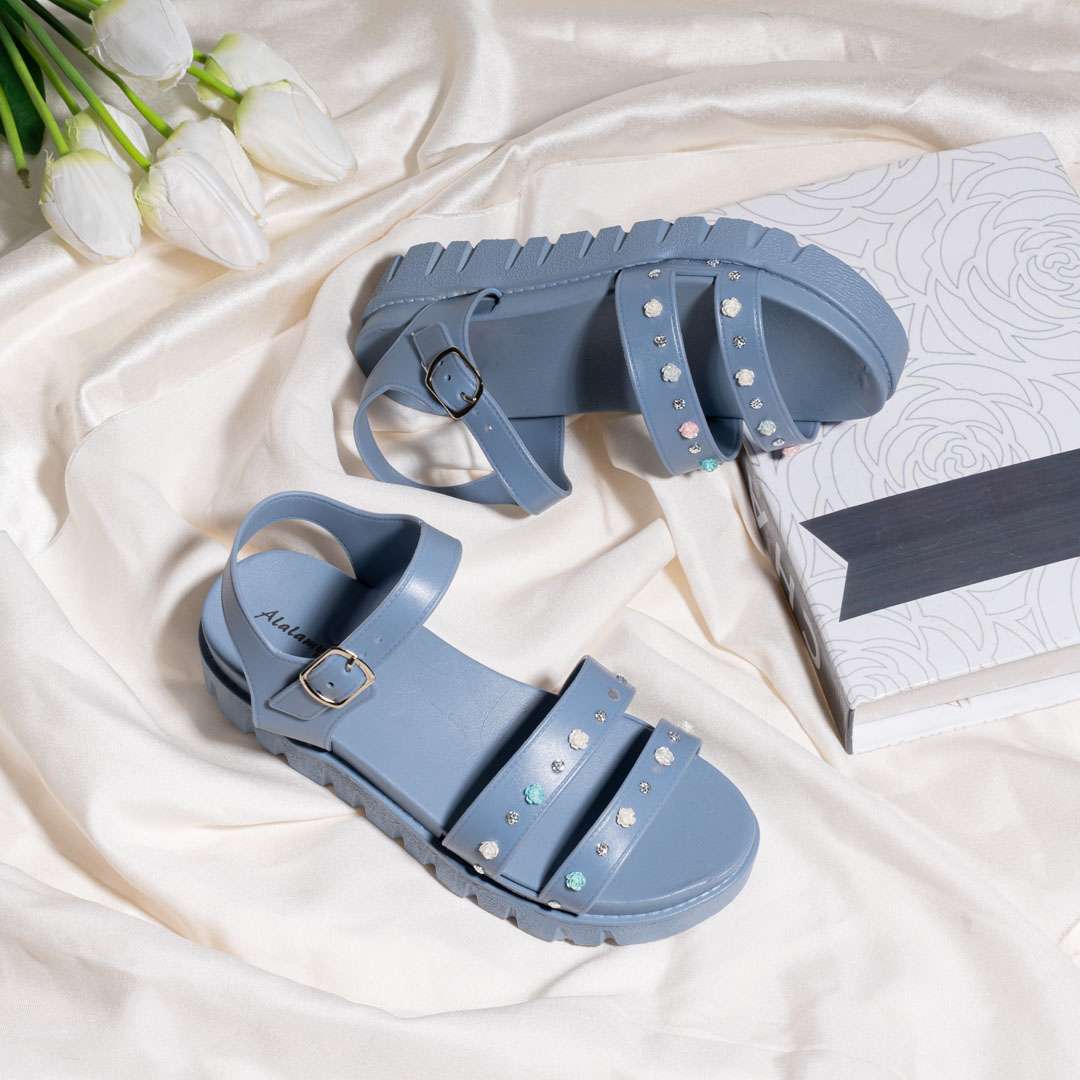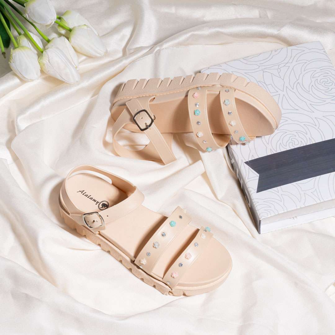 صندل بناتي عصري بخامة EVA مستورد عالية الجودة تصميم ثلاثي الأحزمة بثبات مريح ومظهر أنيق مزين بحليات دائرية تضيف لمسة عصرية ولمعان جذاب نعل عريض ومتين بسطح مانع للانزلاق مزود بإبزيم جانبي ق