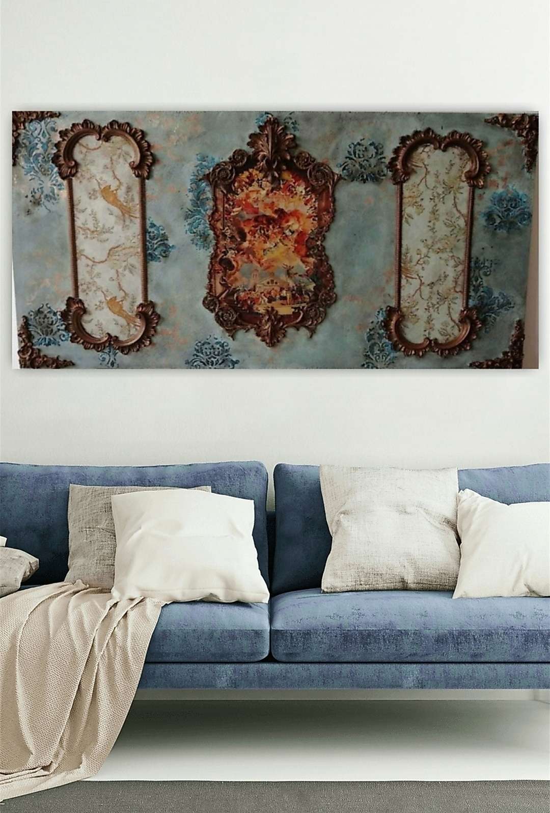 ✨ "عبق الزمن الملكي" ✨ لوحة بتصميم كلاسيكي فخم مستوحى من فن الـ Rococo الأوروبي، مرسومة يدويًا بألوان الأكريليك على الخشب مع تعتيق للأويما لتمنحك لمسة ملكية فريدة في ديكورك. مقاس 100×50 سم. تجمع بي