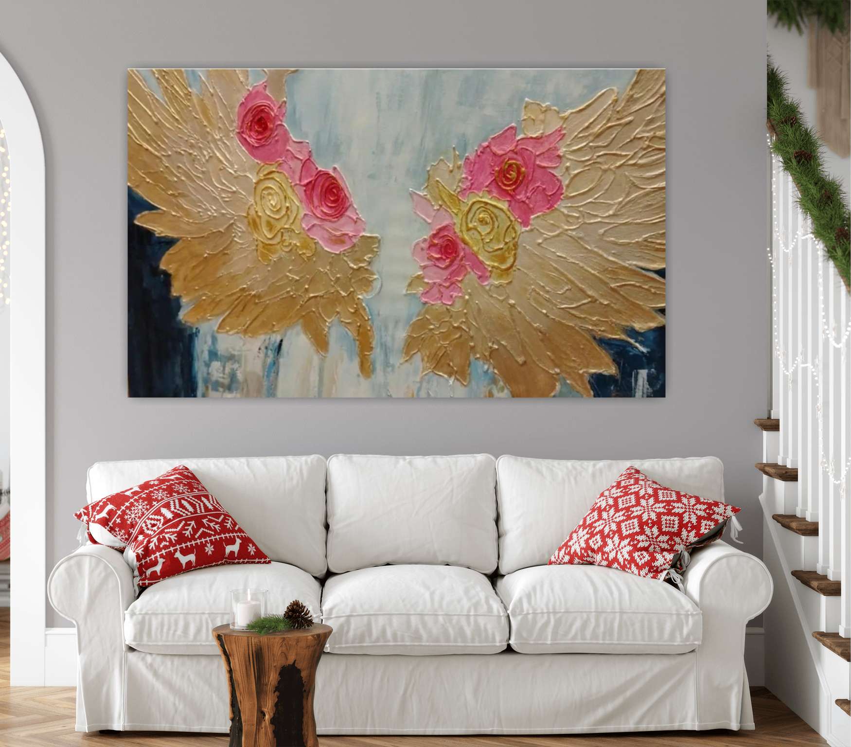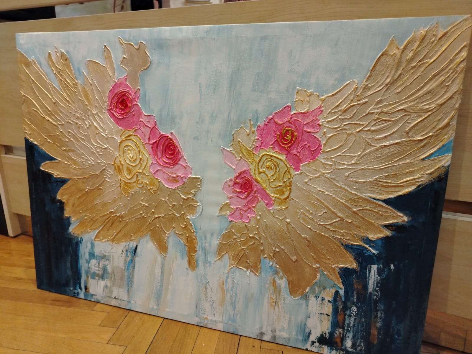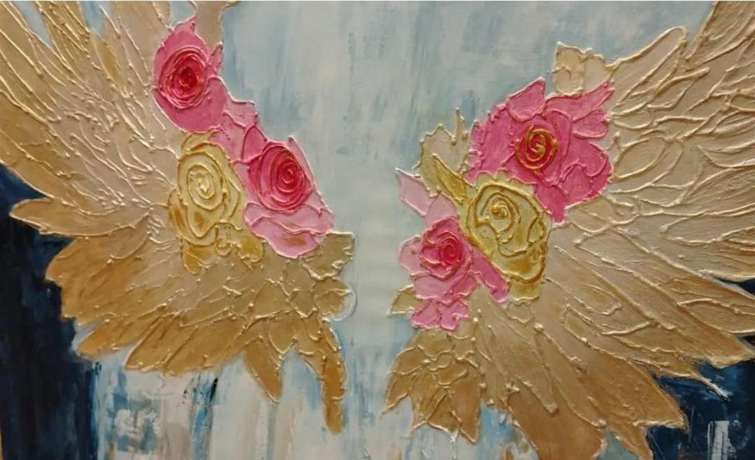 "أجنحة الورد" لوحة فنية مفعمة بالأحاسيس تنبض بالجمال والفخامة، تجمع بين الألوان النابضة بالحياة والتفاصيل الراقية في تصميم أجنحة ذهبية مزخرفة بالورود الوردية. تم رسمها باستخدام معجون بارز وألوان ال