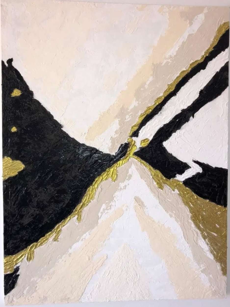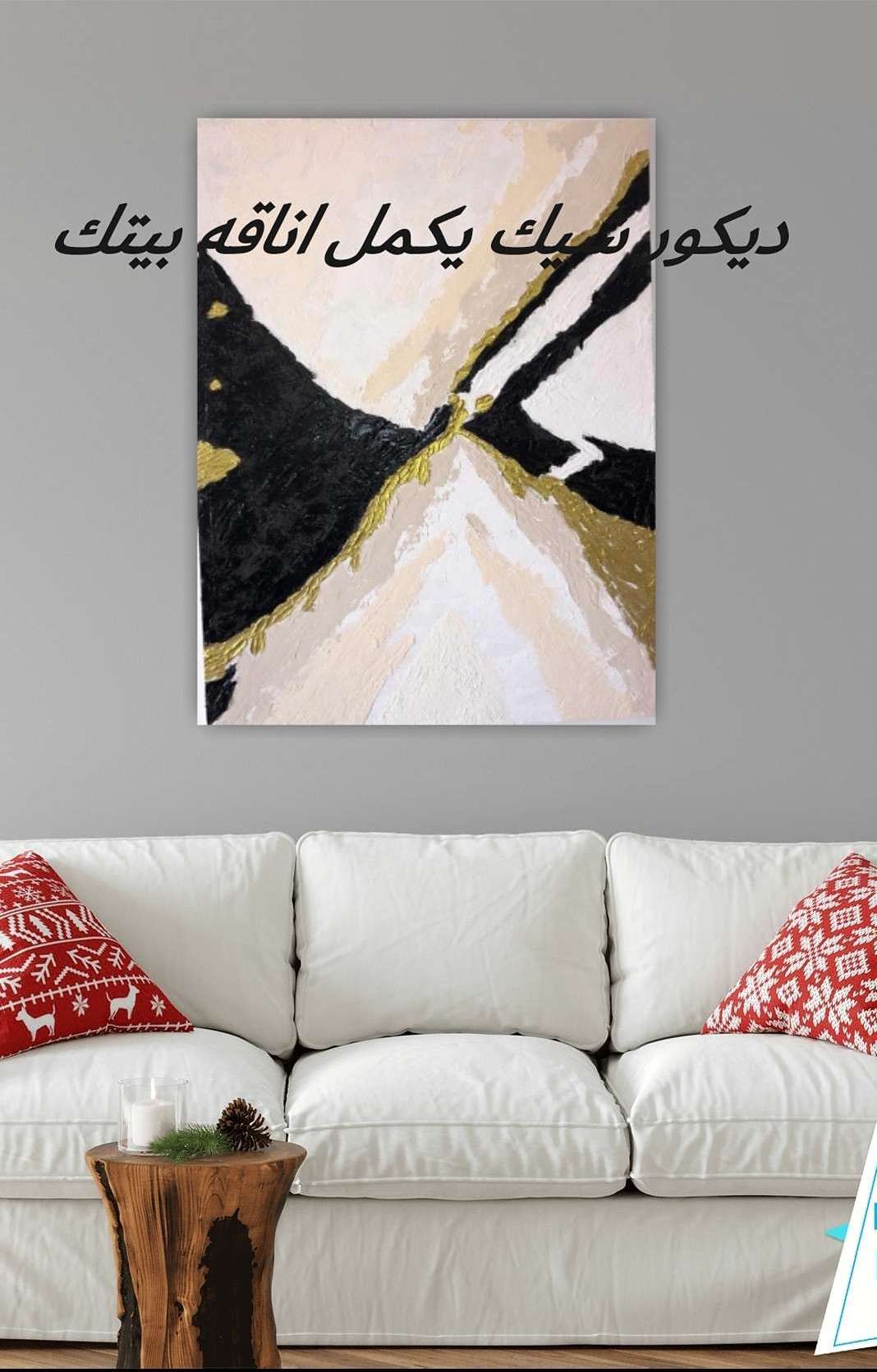 " سحر اللحظه" "لوحة فنية مميزة تجمع بين الألوان الهادئة والفخمة، حيث يتناغم اللون الأسود مع الذهبي والبيج بشكل راقٍ. الرسم اليدوي على لوح كانفس مقاس 60 × 80 سم يعكس حسّاً فنياً عالي المستوى، ويضيف ل