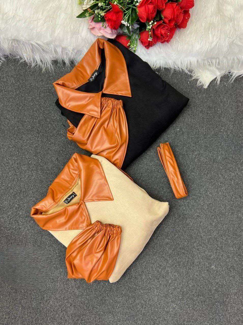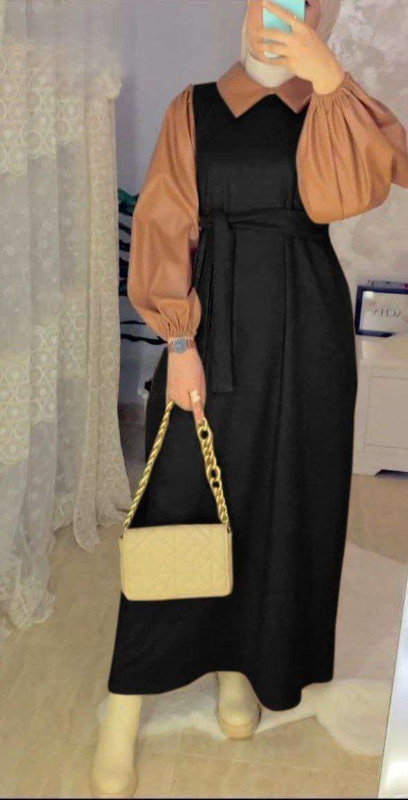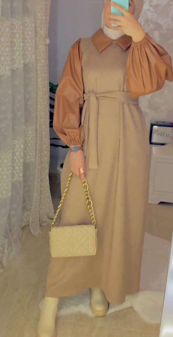دريس ولا أشيك .. لوك كلاسيك بلمسة مودرن الموديل بتاعنا عامل مكس مختلف كم بلونه جلد + ياقة جلد شيك جدًا عاملين كده تاتش بيخلي الدريس تحفة سواء خروجة صباحية أو سهرة بسيطة الخامة شمواه × جلد