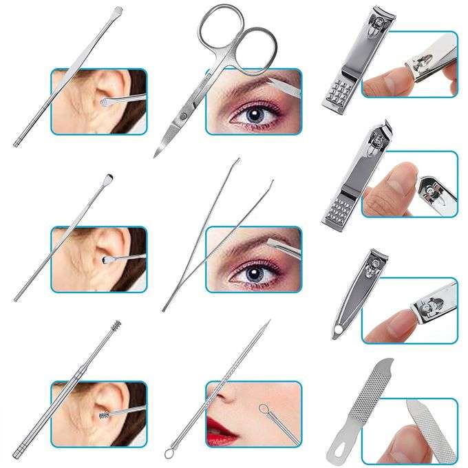 طقم باديكير القمر دة متكون من 12 قطعة مجموعة متعددة من الوظائف 12 قطعة من قصافات الاظافر يمكن استخدامها في تقليم الاظافر والقدمين وتشكيل الحواجب ومقاومة حب الشباب والتقشير وما إلى ذلك مجموعة