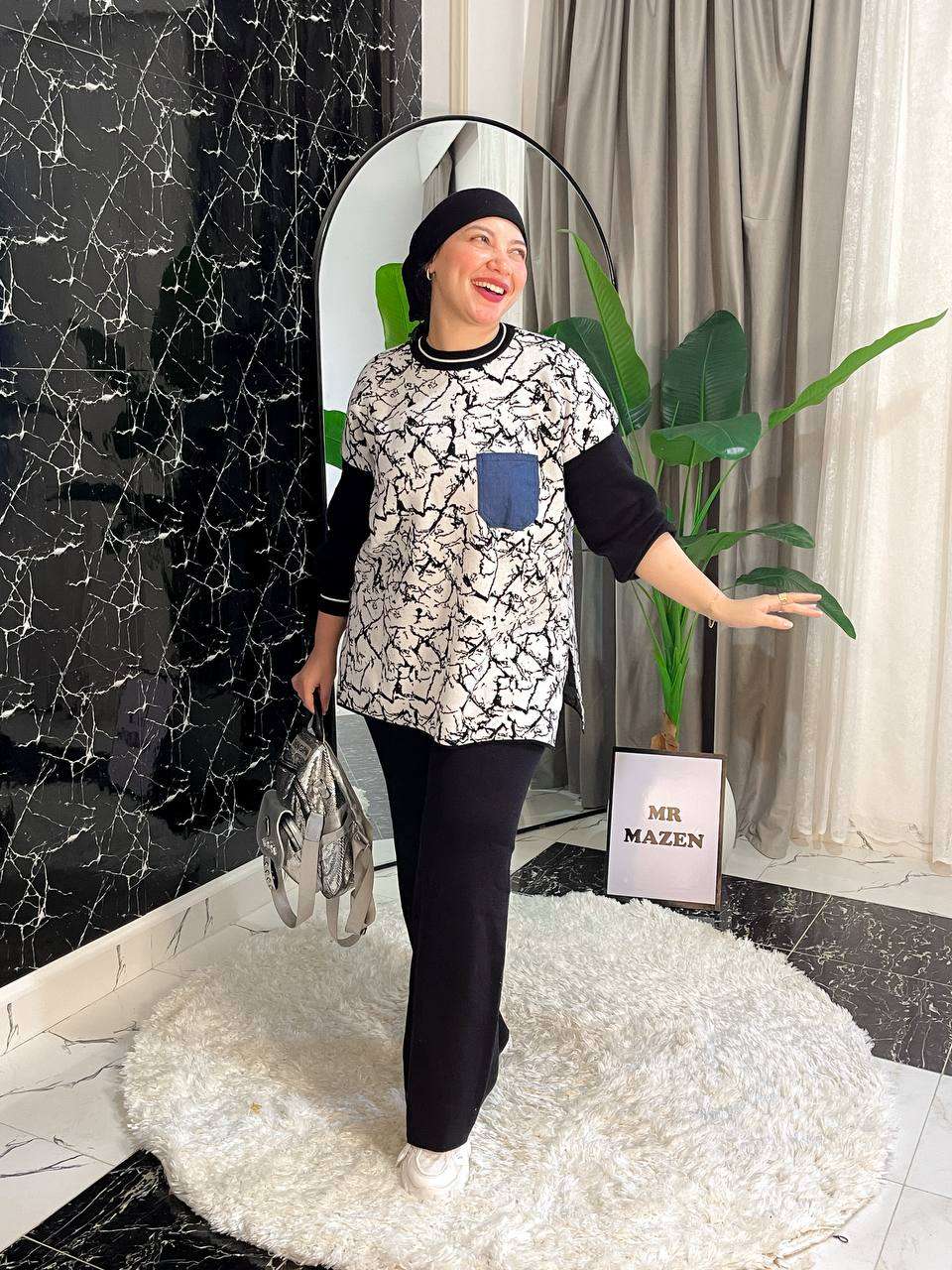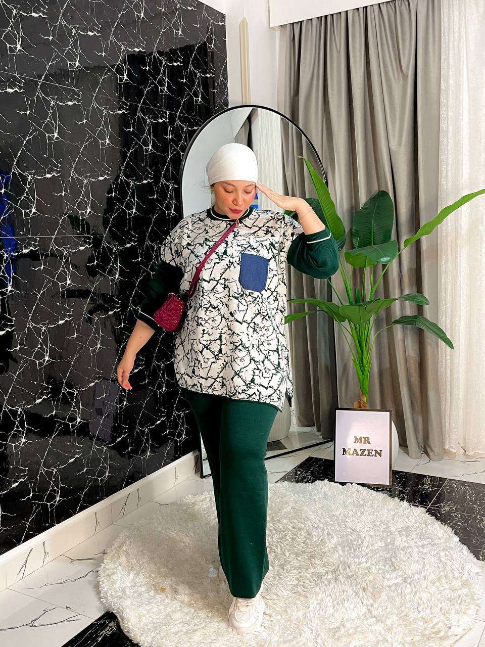 سوت 3 قطع مكون من توب نص كم مسحب وجاكت مشجر 2 لون وبنطلون وايد ليج٨٣٠ج.م- بلاوز قلوب وهم بجد٥٧٠ج.م