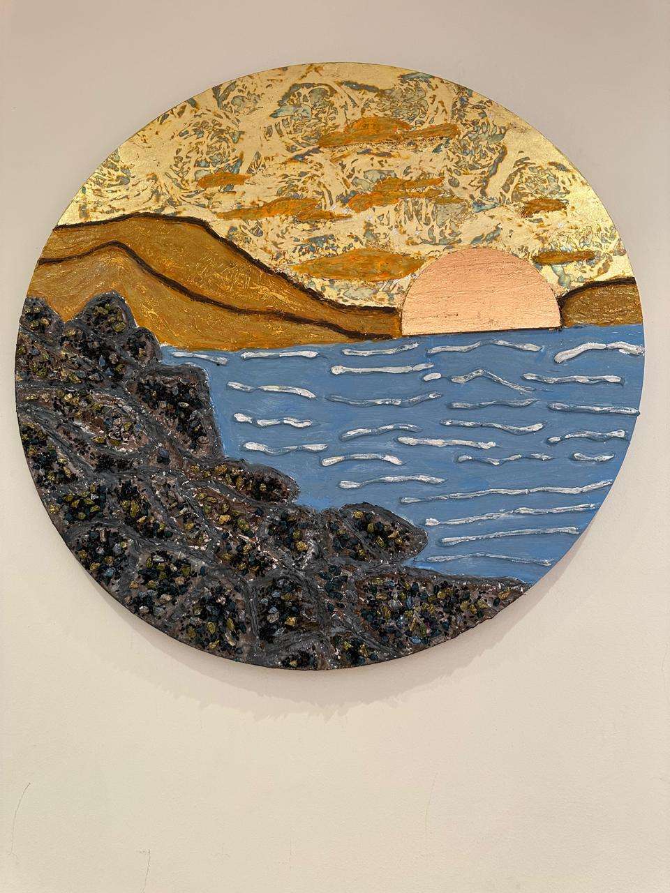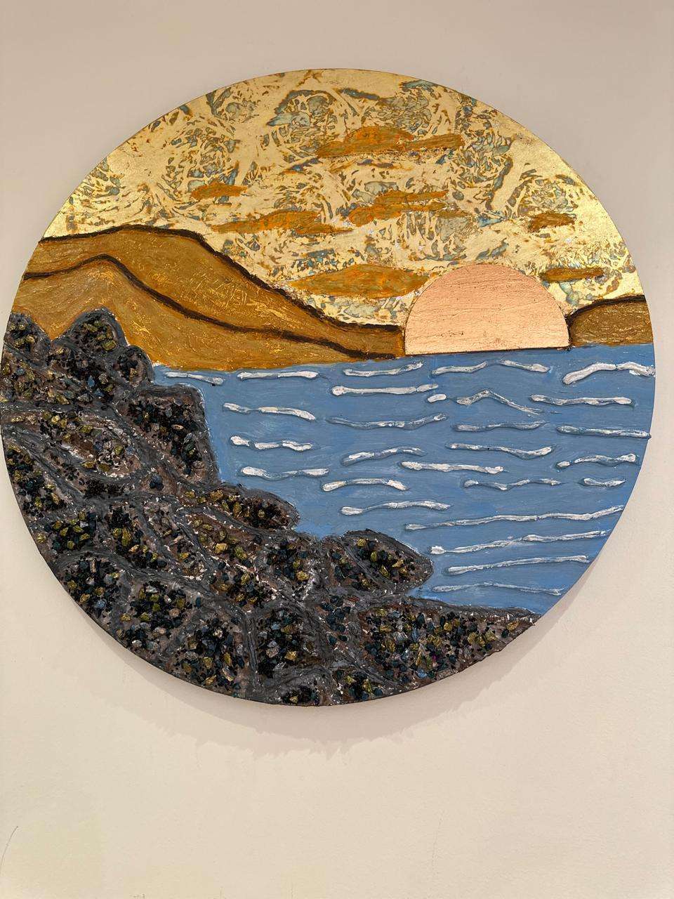 "غروب البخر الذهبي" لوحة يدوية فريدة على قماش دائري بحجم 80 سم، مزخرفة بورق الذهب اللامع والمعجون البارز لإضافة تأثيرات ثلاثية الأبعاد. التصميم يجسد مشهدًا طبيعيًا لغروب الشمس على البحر، مع تفاصيل
