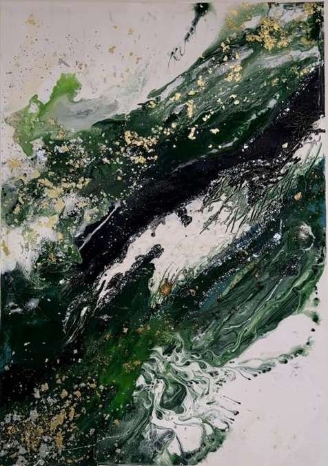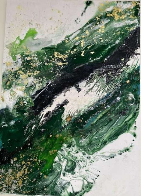 اللوحة تتنقل بين الألوان بشكل حر، حيث تتدفق الألوان بمرونة وتخلق موجات متتابعة تشبه الأمواج المتلاطمة. اللمسات الذهبية والفضية تتناثر مثل نجوم في سماء ليليّة، مما يمنح العمل بُعدًا إضافيًا من الفخامة