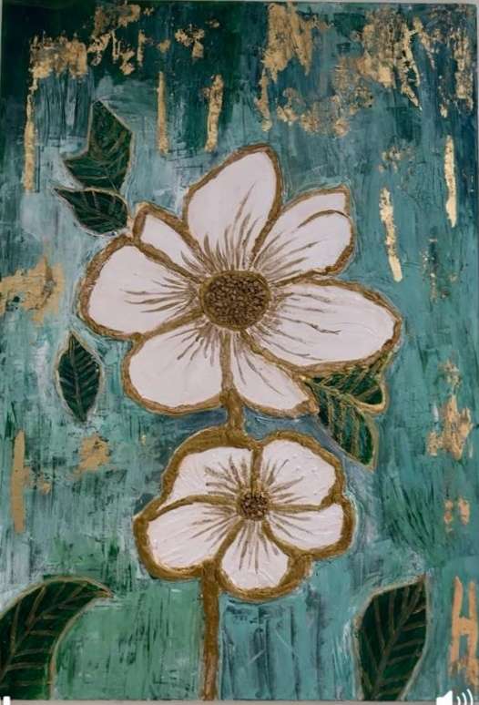 " زهور الذهب" You said: Uploaded image لوحه مرسومه باليد علي الكانفس بالوان الاكليريك وورق الذهب والمعجون البارز مقاس ٧٠ × ٩٠ اسم اللوحه وصف الل حه بطريقه مميزه وفيها كل البيانات الخاصه بالمق