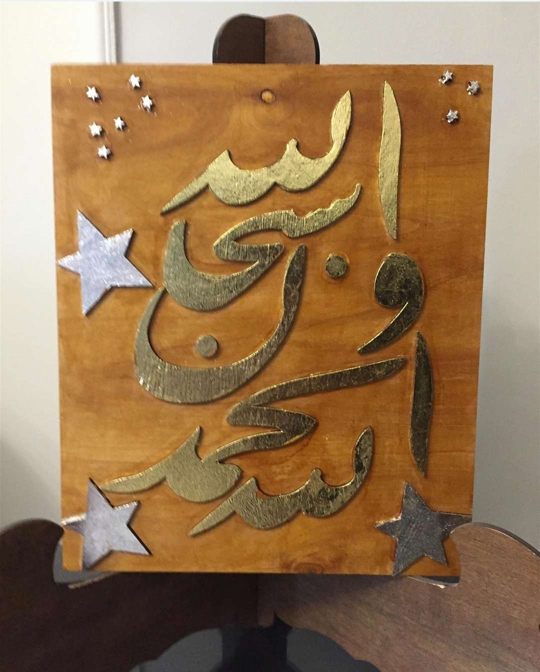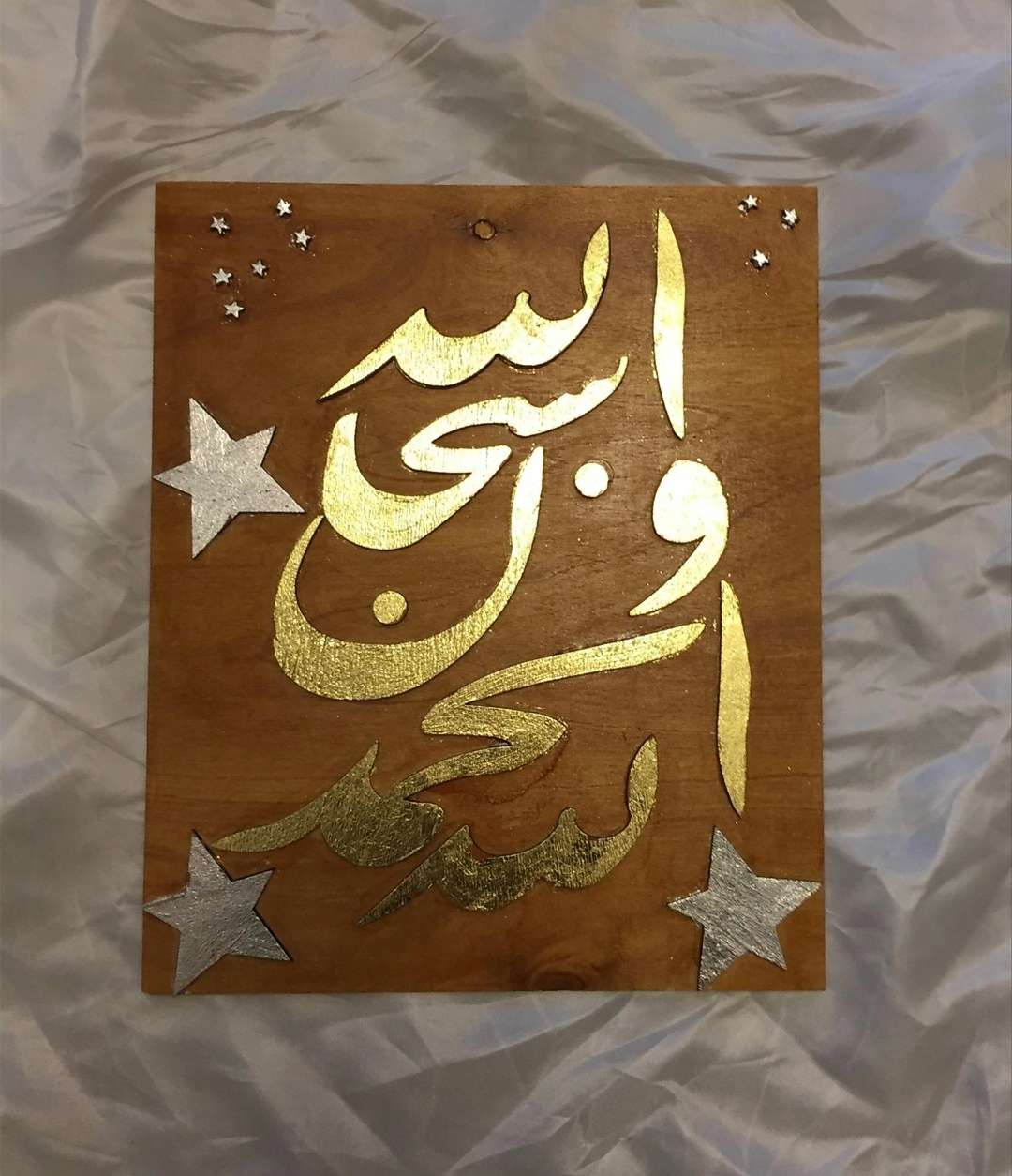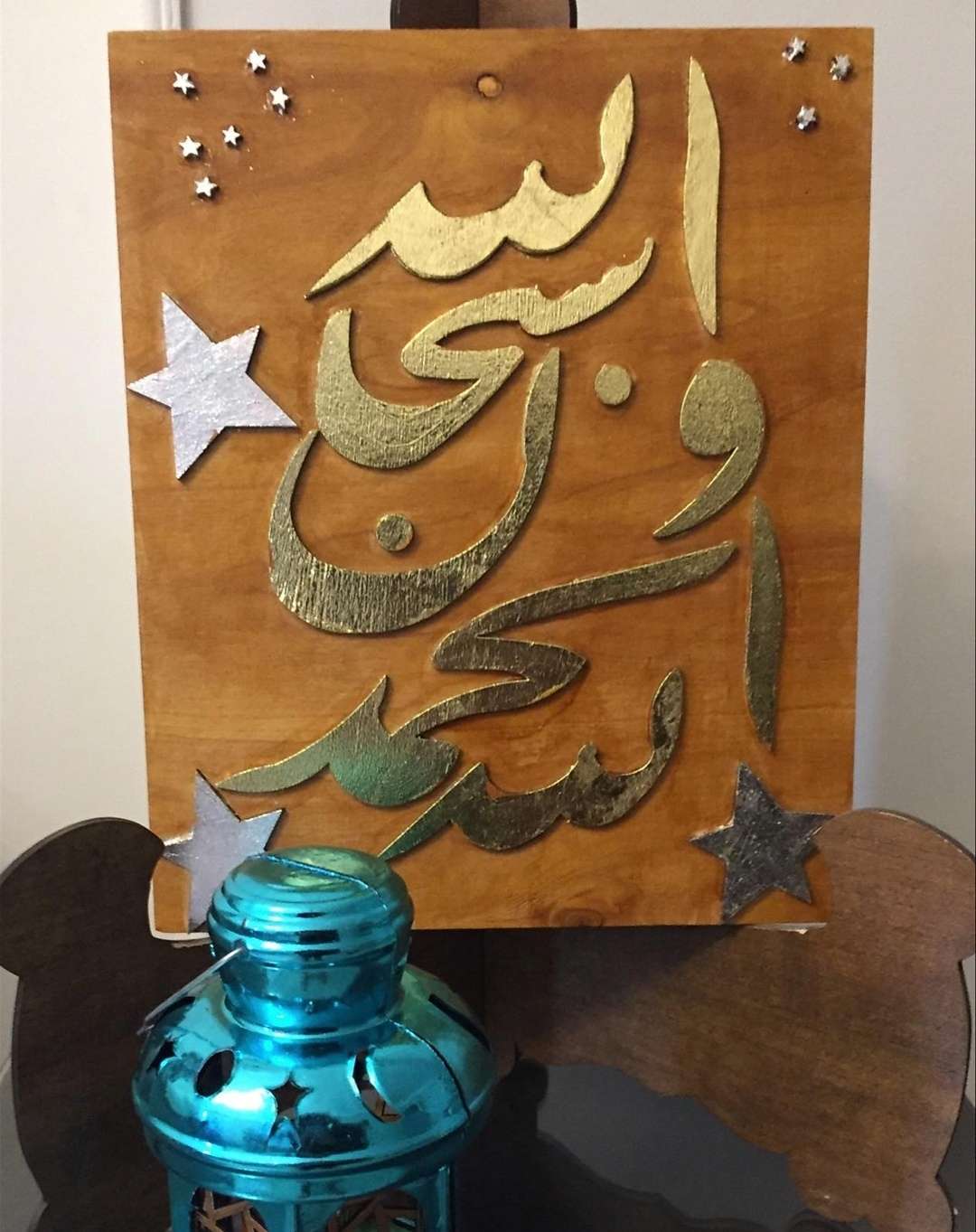 اللوحة عبارة عن قطعة فنية فاخرة مصنوعة من الخشب الطبيعي المزخرف بتقنيات حديثة. تحتوي اللوحة على زخارف فنية بخامات عالية الجودة مثل ورق الذهب والفضة، مما يضفي عليها طابعاً مميزاً وأنيقاً. الكتابة بخط ع
