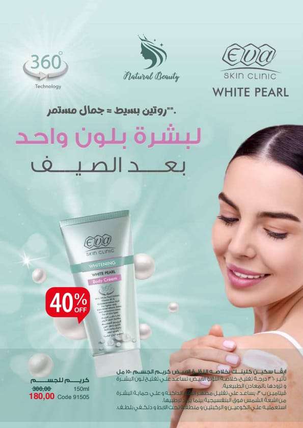 وايت بيرل مش بس بتعتني ببشرة الوجة، بنقدم لك كريم يساعدك على تقليل البقع الداكنة بالجسم. #إيڤا_سكين_كلينيك_وايت_بيرل #تكنولوجيا_360_درجة #نورك_بيزيد #بشرتك_نورك